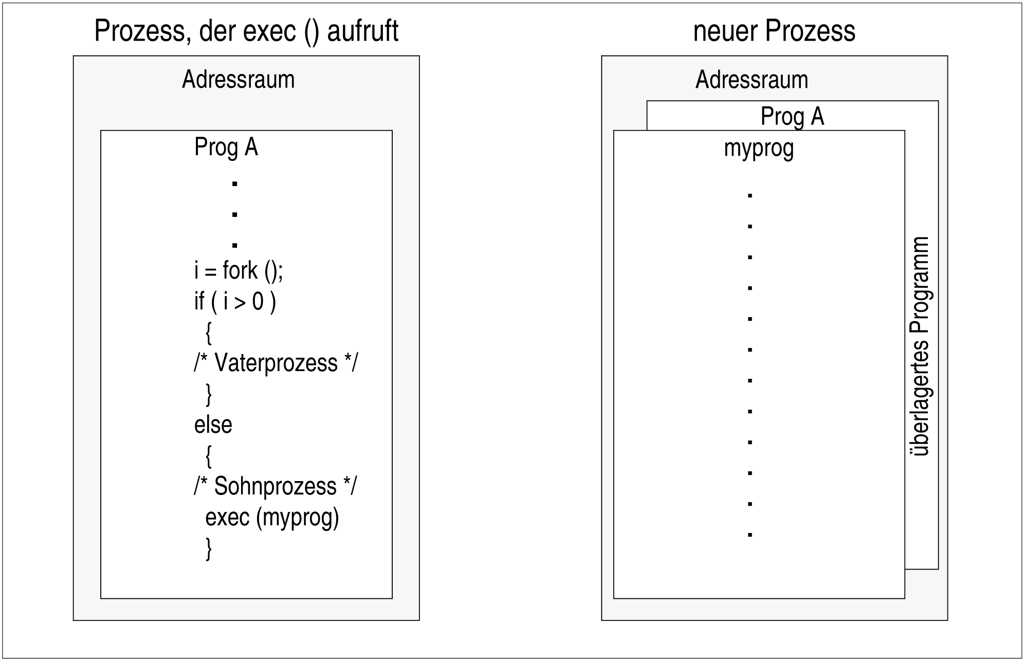Wenn in einem Programm die Funktion exec aufgerufen wird, wird die aktuelle Prozessumgebung von einer neuen vollkommen überlagert. Dadurch kann z.B. in einem Sohnprozess ein anderes Programm ablaufen als im Vaterprozess. Die Prozesse bleiben aber durch die Vater-Sohn-Beziehung weiterhin verbunden.
