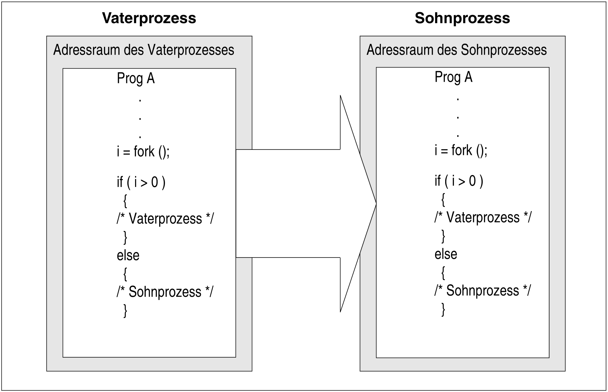 Durch den Aufruf der Funktion fork wird von einem Vaterprozess ein neuer Sohnprozess erzeugt. Die Funktion fork erzeugt eine neue Prozessumgebung und kopiert ausgewählte Informationen des Vaterprozesses für den Sohnprozess. Dem Sohnprozess steht ein eigener, vom Vaterprozess abgesonderter Adressraum zur Verfügung. Der Sohnprozess kann auf alle vom Vaterprozess geöffneten POSIX-Ressourcen zugreifen.