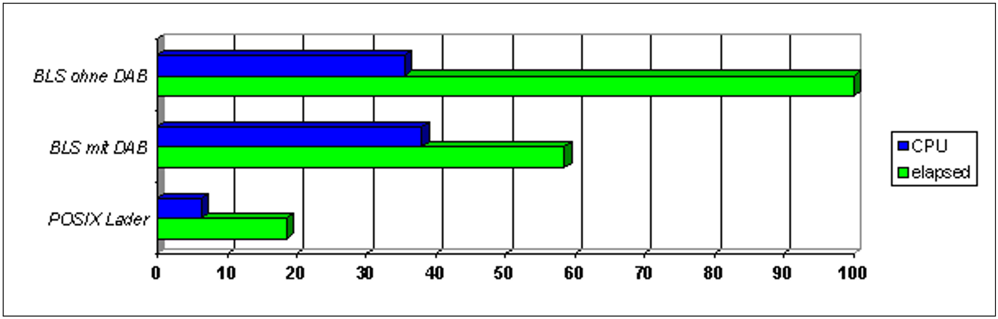 Die Ladezeit eines POSIX-Programms hängt erheblich von der Größe des Programms ab und macht in der Regel mindestens ca. 35% der Gesamtausführungszeit aus. Zurückzuführen ist dies größtenteils auf Bibliothekszugriffe in DMS/PLAM, die auf Anforderung von BLS durchgeführt werden. Durch den Einsatz von DAB lassen sich die Programmladezeiten erheblich verkürzen. Dies allerdings nur, wenn alle Bibliotheken, die an einem Ladevorgang beteiligt sind, auch tatsächlich erfasst werden.