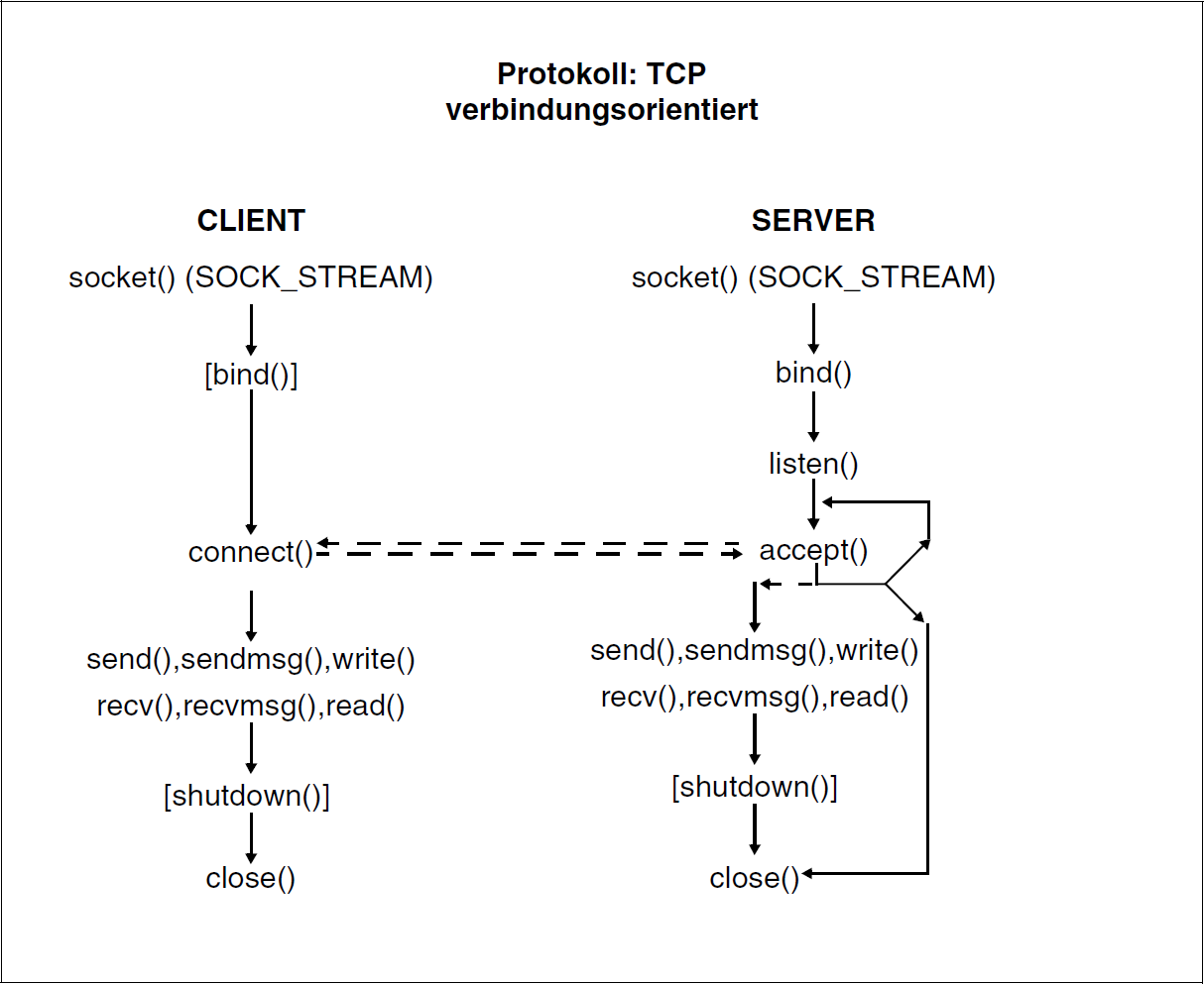 Das folgende Bild veranschaulicht das Zusammenspiel der Funktionen der SOCKETS(POSIX)-Schnittstelle bei Stream-Sockets (SOCK_STREAM) in den Internet-Domänen AF_INET und AF_INET6: