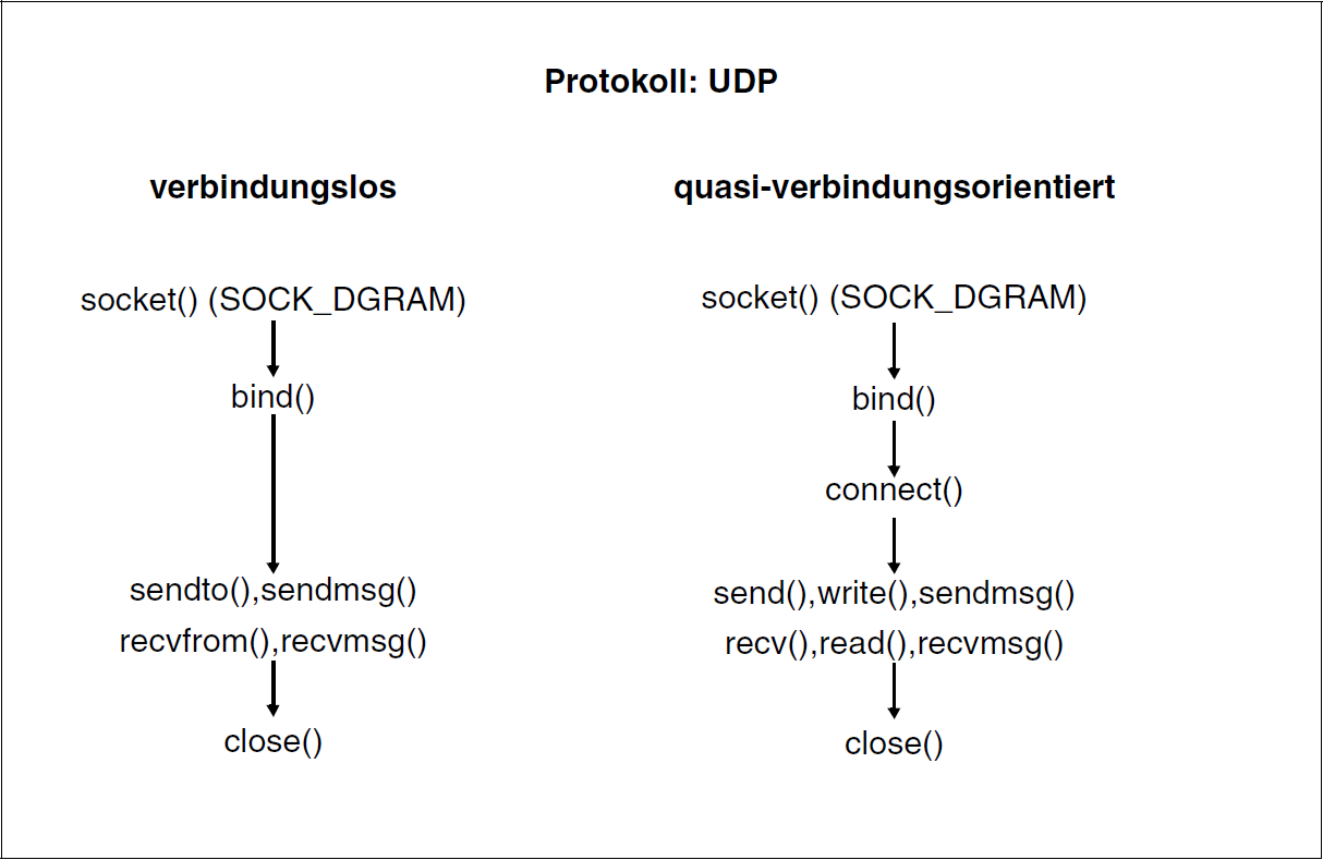 Das folgende Bild veranschaulicht das Zusammenspiel der Funktionen der SOCKETS(POSIX)-Schnittstelle bei Datagramm-Sockets (SOCK_DGRAM) in den Internet-Domänen AF_INET und AF_INET6: