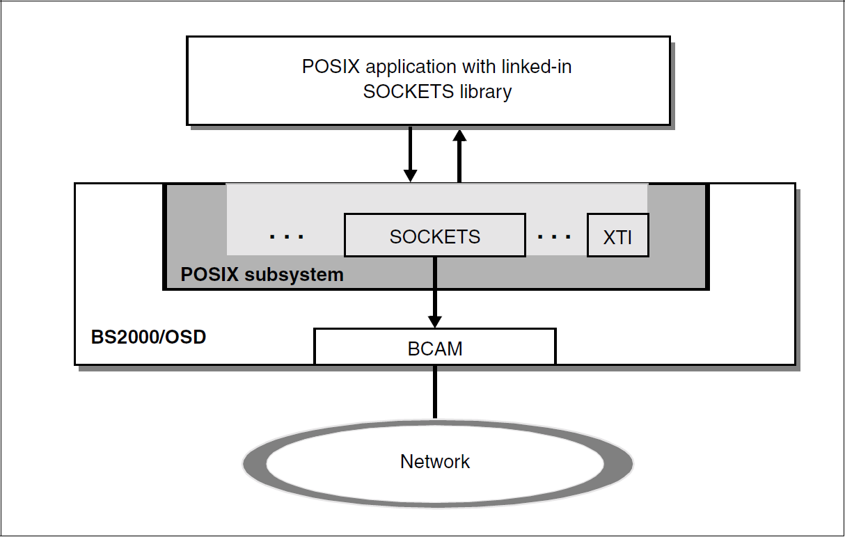 The SOCKETS interface is defined in a separate library. If this library is linked into a POSIX application, the SOCKETS interfaces set up the connection to the network over the POSIX subsystem and BCAM transport system.