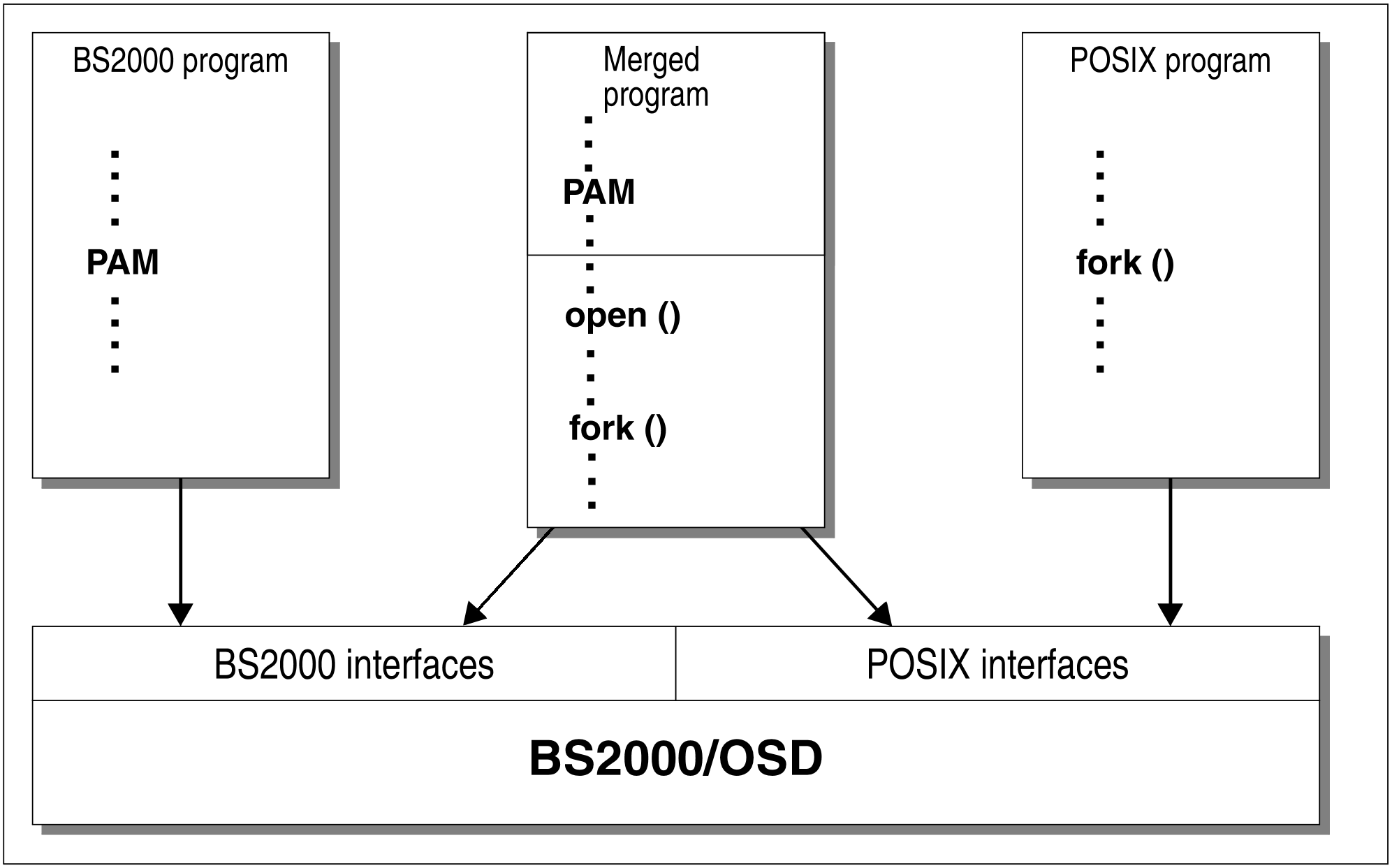 The POSIX program interfaces are available in addition to the BS2000 program interfaces. As a result, pure BS2000 programs, pure POSIX programs and merged programs can be executed. Merged programs contain both BS2000 and POSIX program interfaces, and are subject to certain restrictions (see "Restrictions for programs with merged functionality").