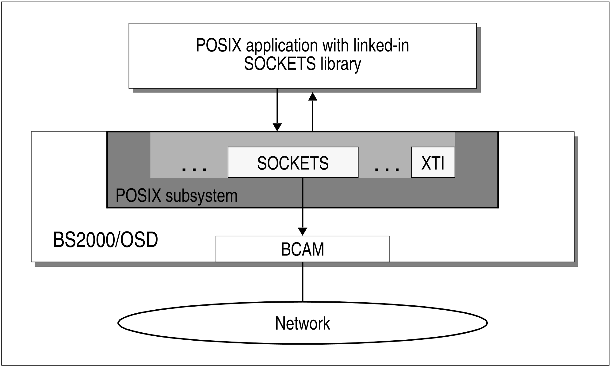 The SOCKETS/XTI interfaces are supplied with POSIX-SOCKETS and defined in a separate library. If this library is linked into a POSIX application, the SOCKETS/XTI interfaces generate the connection to the network via the POSIX subsystem and the BCAM transport system.
