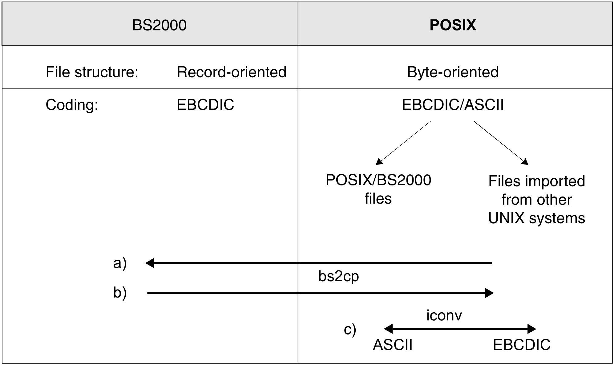 Routines for the conversion of data between POSIX and BS2000 formats are available in order to permit the exchange of POSIX and BS2000 files. Files are converted from the EBCDIC DF 03 character set to ASCII ISO 7-bit code, and vice versa (see also chapter “Tables and directories”). Only pure text files can be converted.