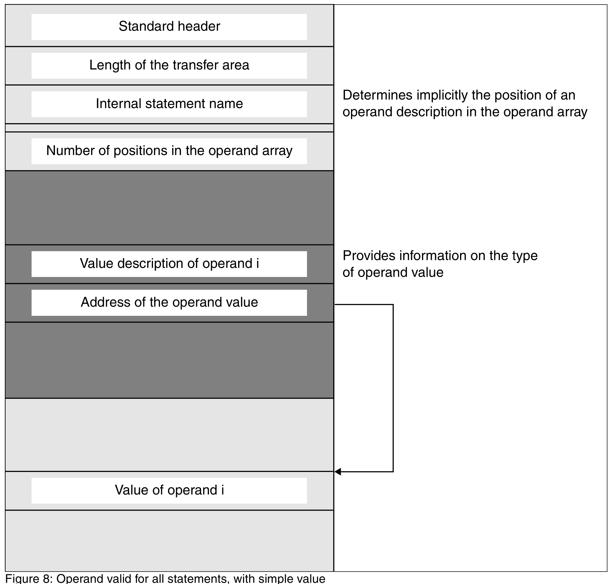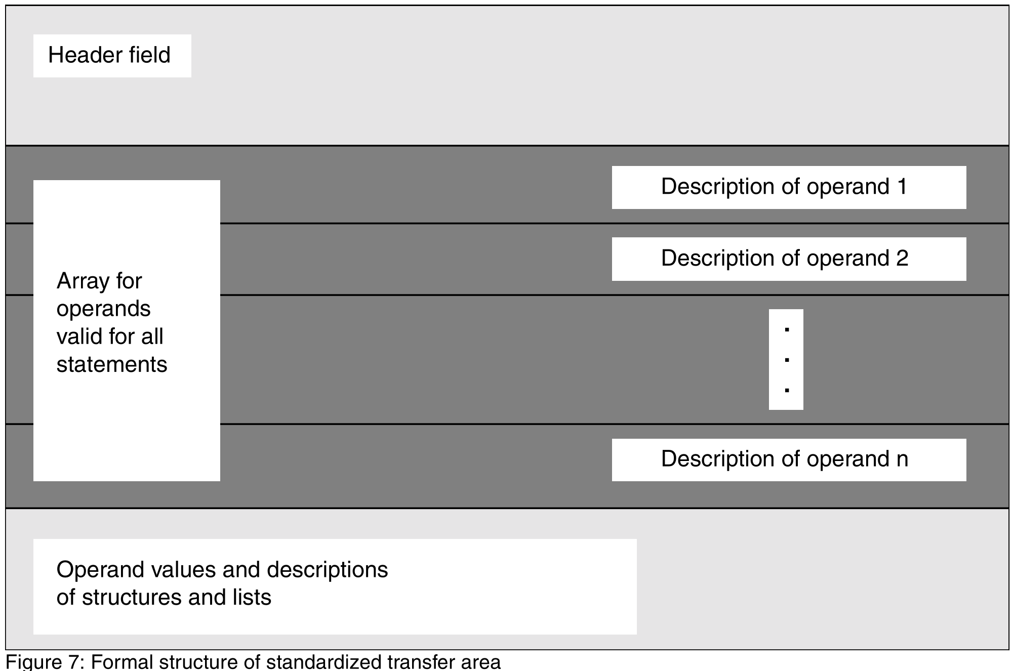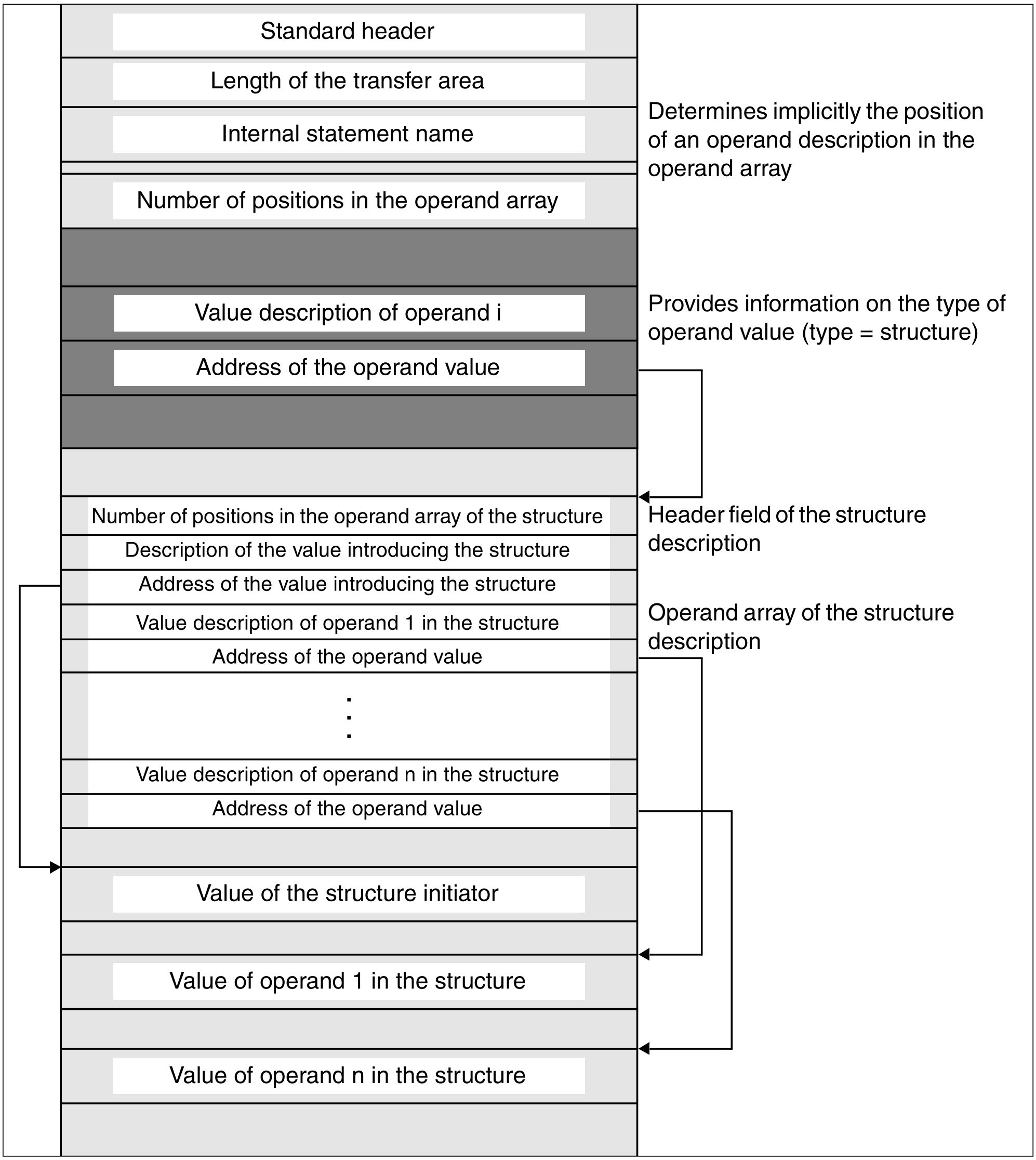 The standardized transfer area begins on a word boundary. The header field is in bytes 0 through 39. It contains, amongst other things, the internal statement name and the statement version (see ADD-STMT ...,INTERNAL-NAME=...,STMT-VERSION=...). The array for operands valid for all statements, i.e. for operands defined with RESULT-OPERAND-LEVEL=1 (see ADD-OPERAND), begins with byte 40. It accommodates an8-byte description for each of these operands. The operand descriptions are arranged in the order resulting from the operand positions established in the statement definition (see ADD-OPERAND ...,RESULT-OPERAND-NAME=*POSITION(POSITION=<integer>)). Each operand description contains, among other things, the absolute address where the associated operand value, or the description of the associated list or non-linearized structure, is stored in the transfer area. The description of a non-linearized structure contains an operand array describing the operands contained in the structure. It has the same format as the array for the operands valid for all statements.