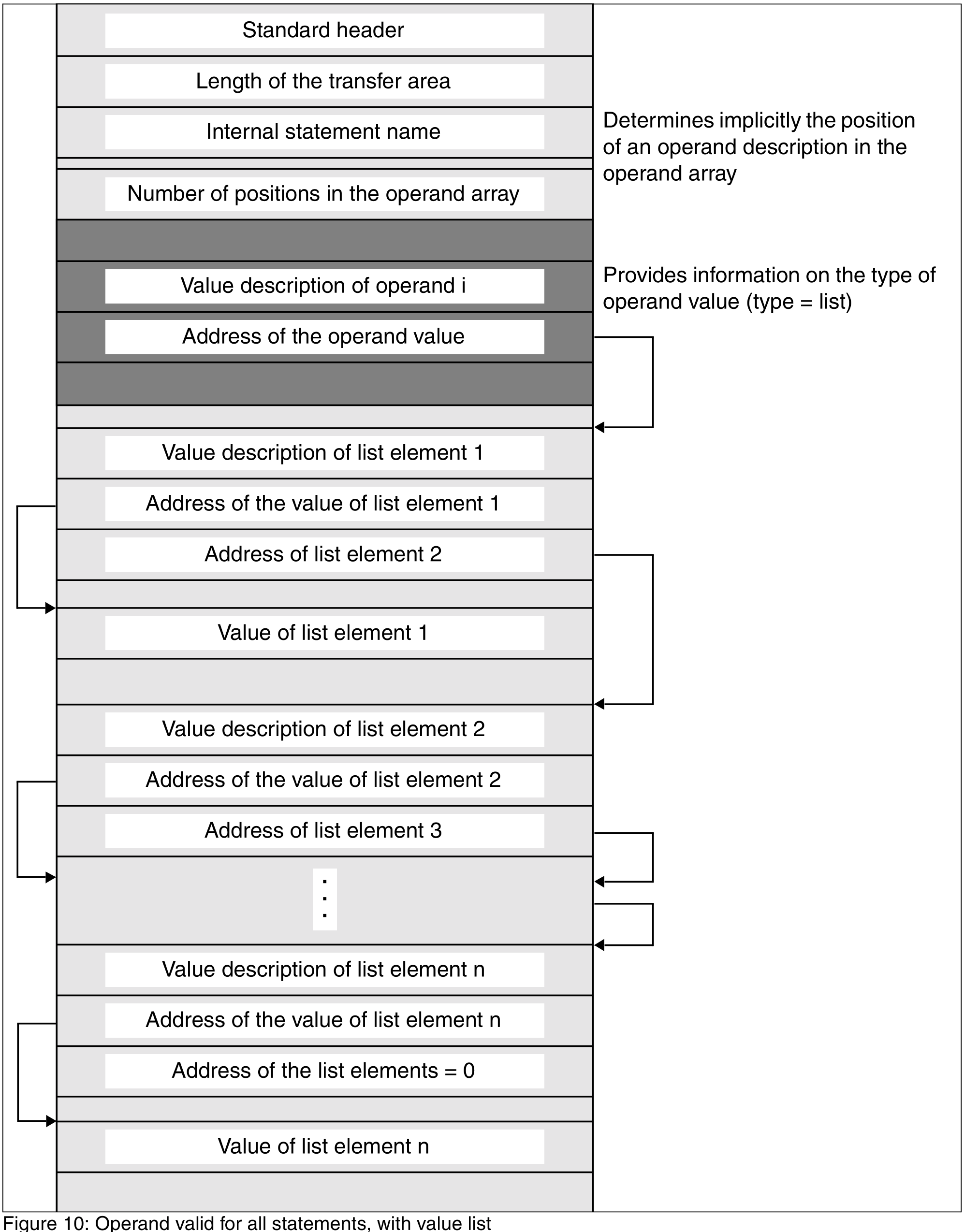 Values for operands defined with ADD-OPERAND ...,LIST-POSSIBLE=*YES (...,FORM=*NORMAL) are transferred in the form shown in Figure 10. A structure may be attached to a list element. In this case, “value of the list element” is a structure description.