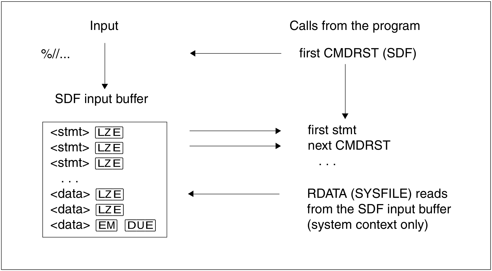 Blocked input of statements may also include records. These can then be read with RDATA (SYSFILE) after CMDRST, but only in the system context: