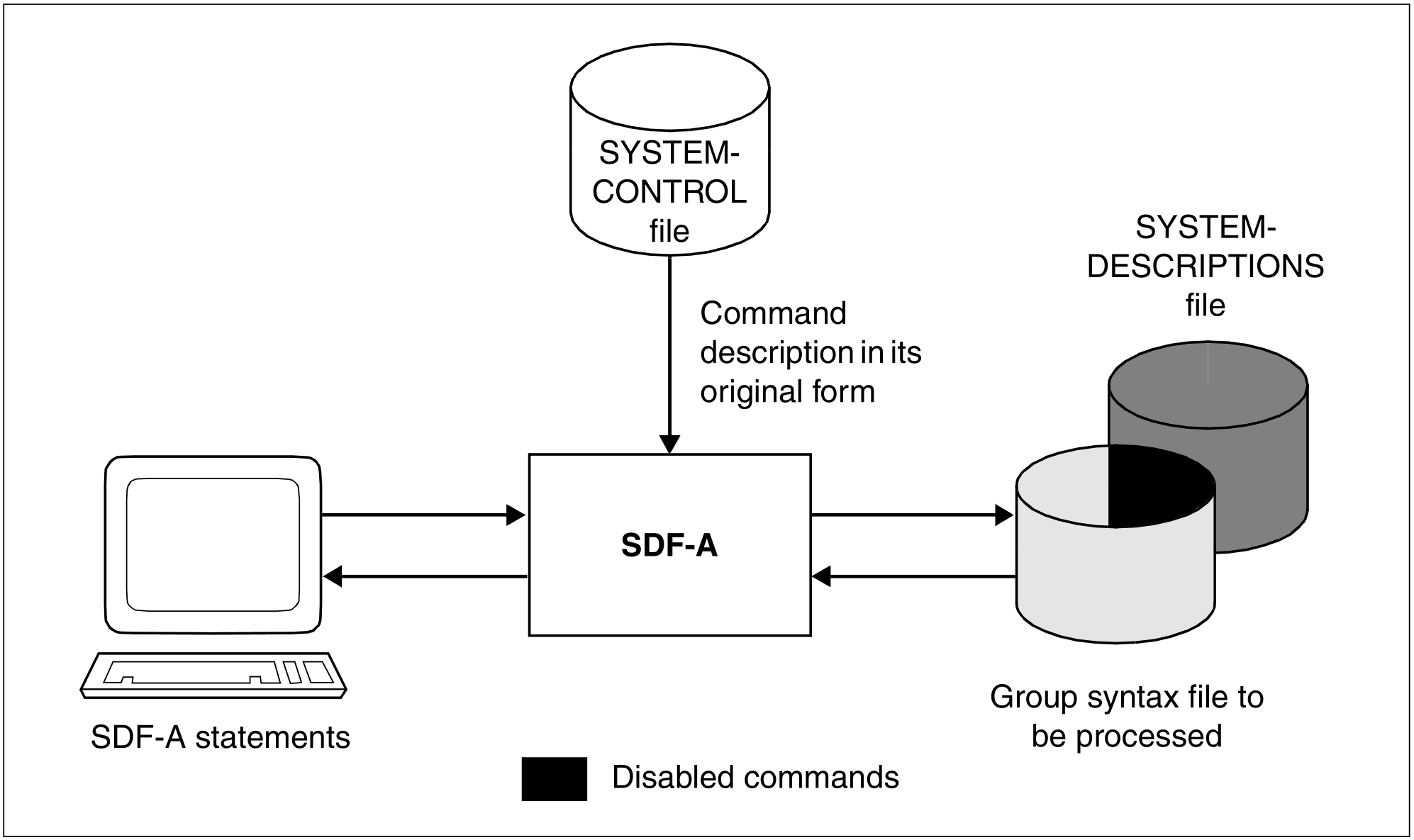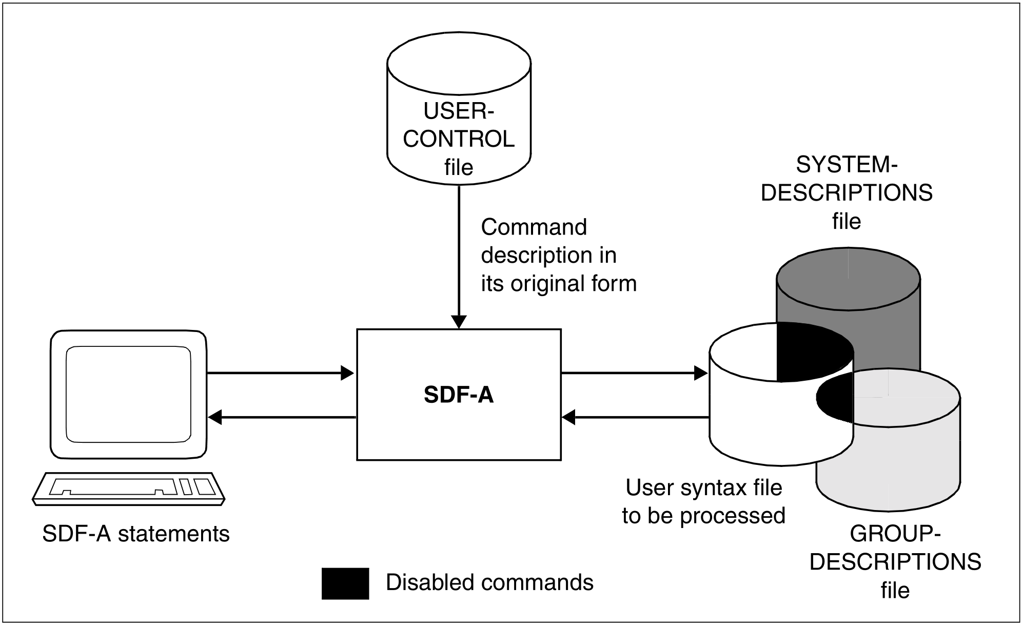 If a command that is defined in the SYSTEM-DESCRIPTIONS file is to be disabled, it is absolutely essential to specify this file when the group syntax file is opened. Otherwise, SDF-A merely deletes the definition in the group syntax file (if there is one), without placing a corresponding lock entry there.