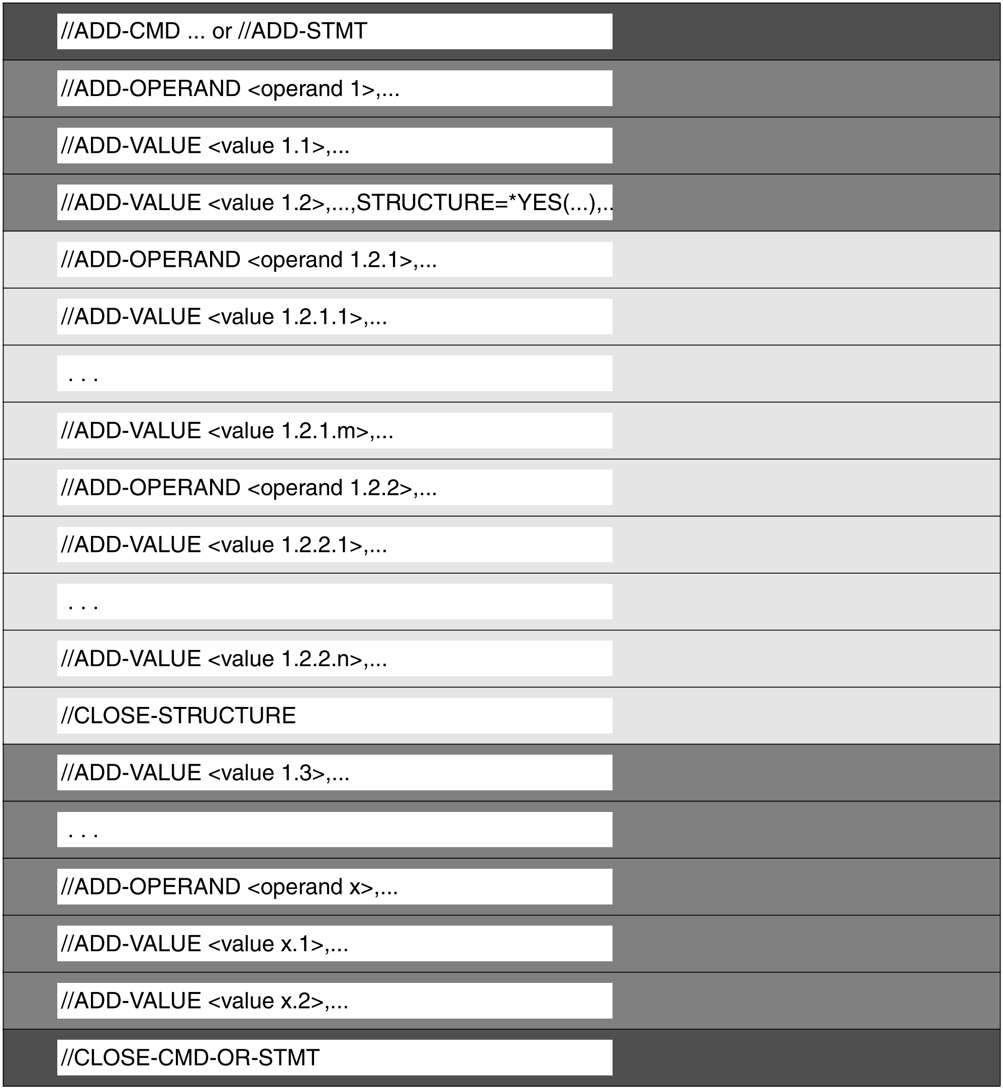 Establish the framework of the command or statement (its name, operands, operand values, structures) using very simple ADD statements containing only a few specifications (default values).