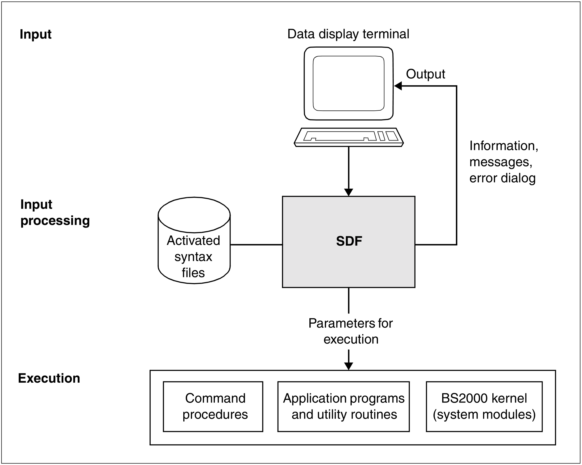 The syntax files are assigned, as required, by IMON during installation and activated accordingly in the system (see “SDF Dialog Interface” [1]). When SDF processes a command that has been entered, it retrieves the information needed to do so from the activated syntax files (see section “File hierarchy”).