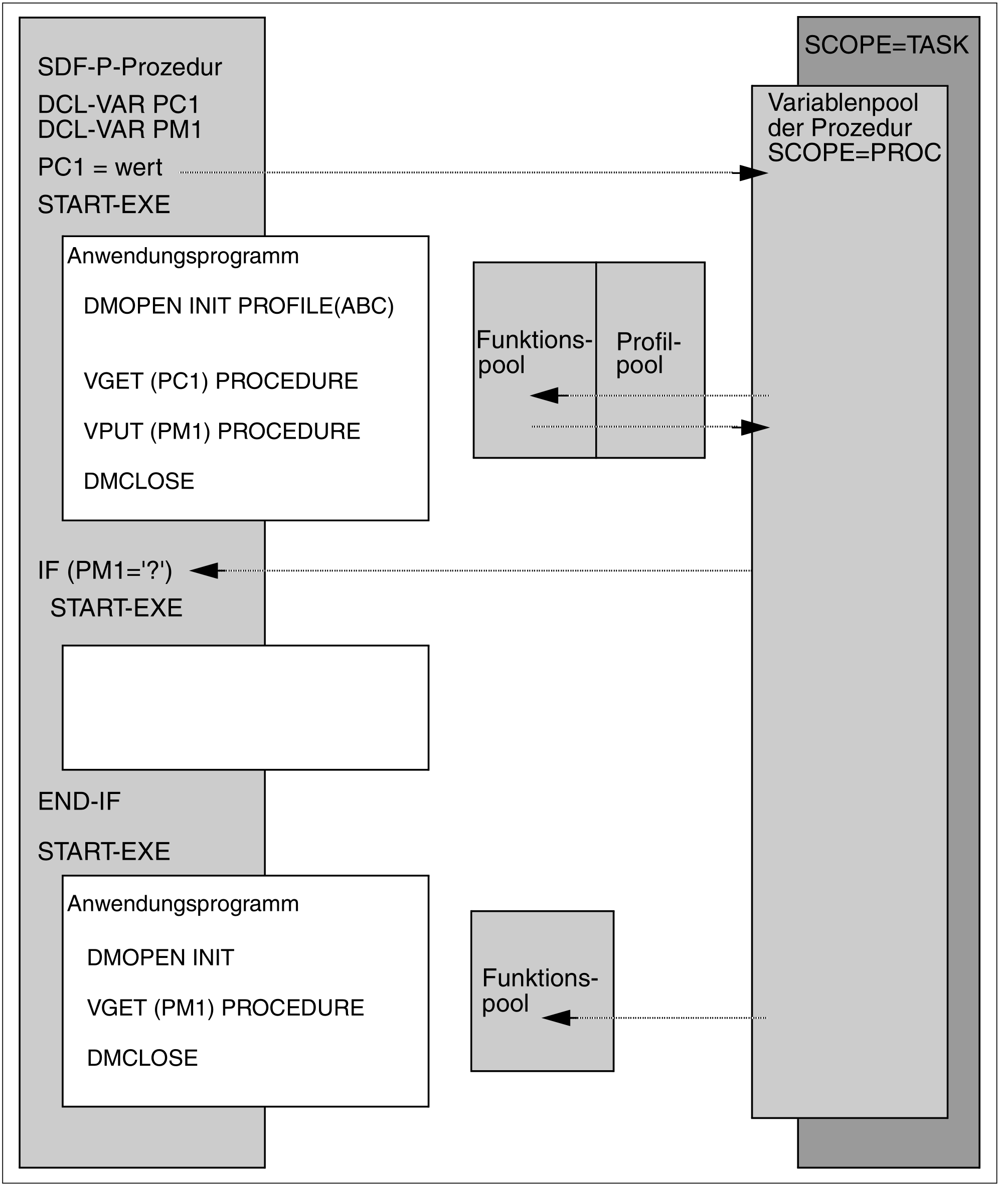 Die Makros VGET und VPUT in FHS erlauben einem Anwendungsprogramm, einfache S-Variable zu lesen und zu schreiben. Damit ist eine Kommunikation zwischen einer S-Prozedur und einem von dieser Prozedur aufgerufenen Anwendungsprogramm möglich.