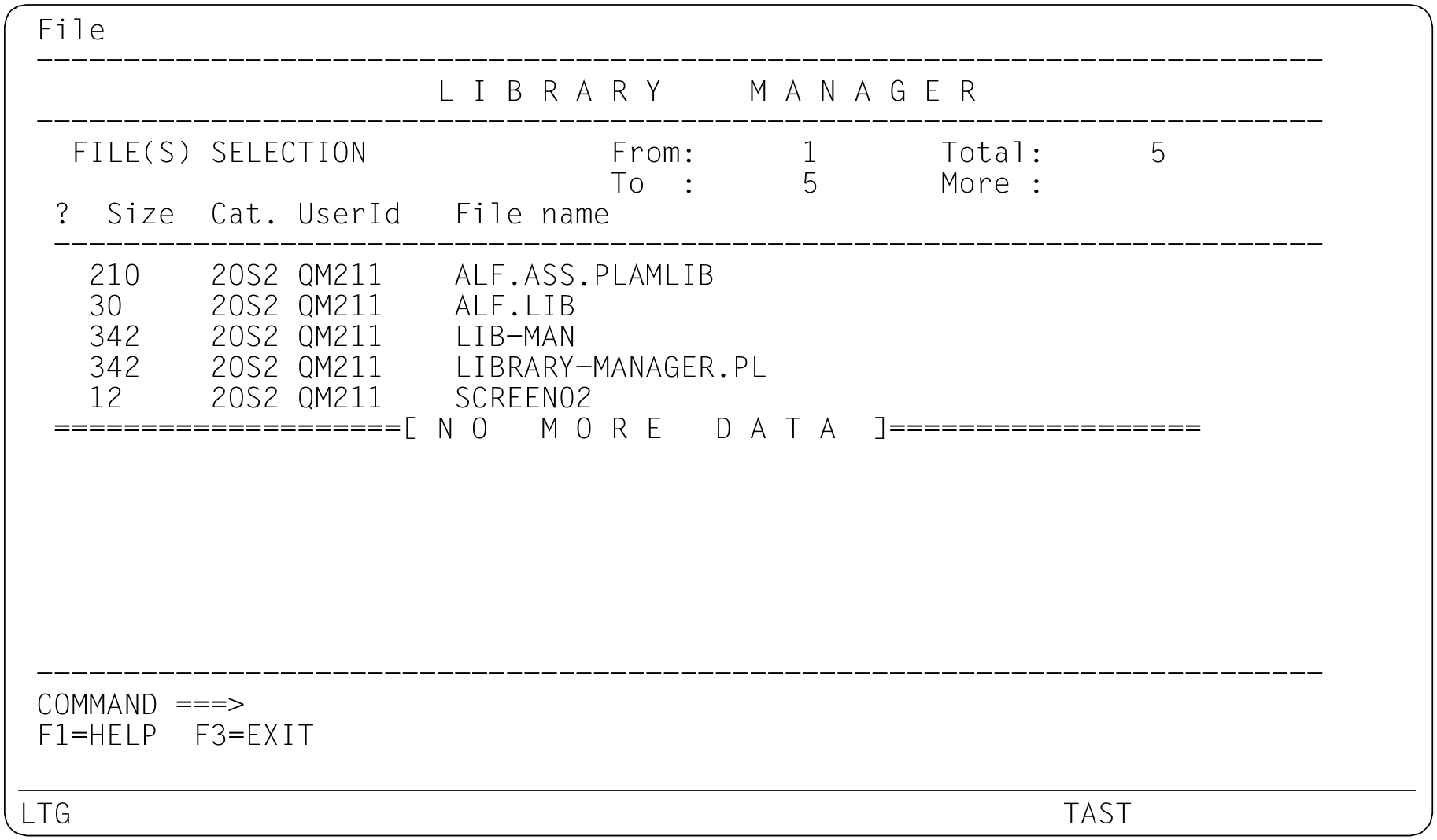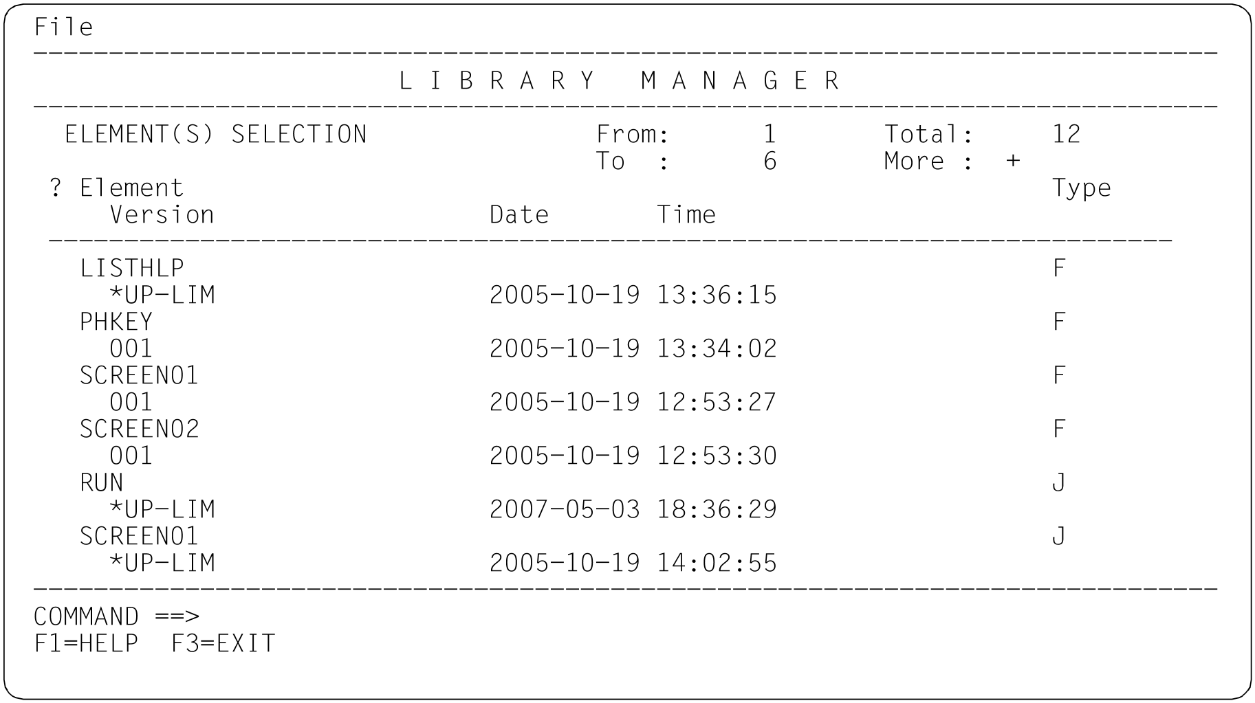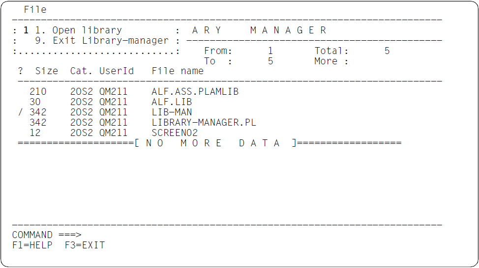 It is now possible to open the listed libraries, and request a display of the appropriate elements. To do so, identify the library to be opened by marking the start of the corresponding line with a “/”; press the tab key to move the cursor into the “FILE” field (top left);