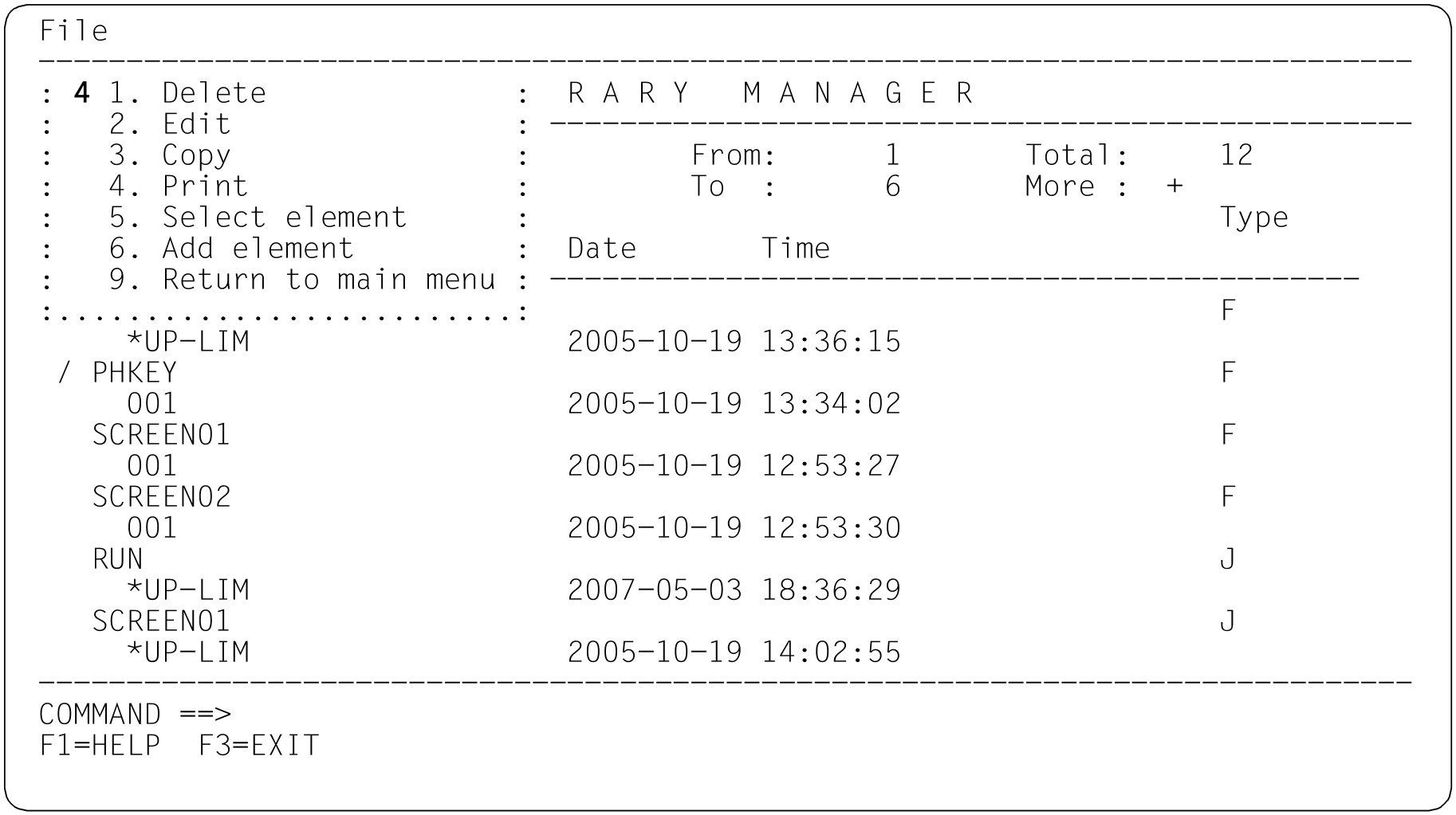 A further option at this point is to process any of the listed elements. To do so, identify the element to be processed (e.g. PHKEY) by marking the start of the corresponding line with a “/”; press the tab key to move the cursor into the “FILE” field (top left); press the key, and enter into the pull-down menu which now appears the number which corresponds to the required processing for the element (e.g. “4” to print it out).