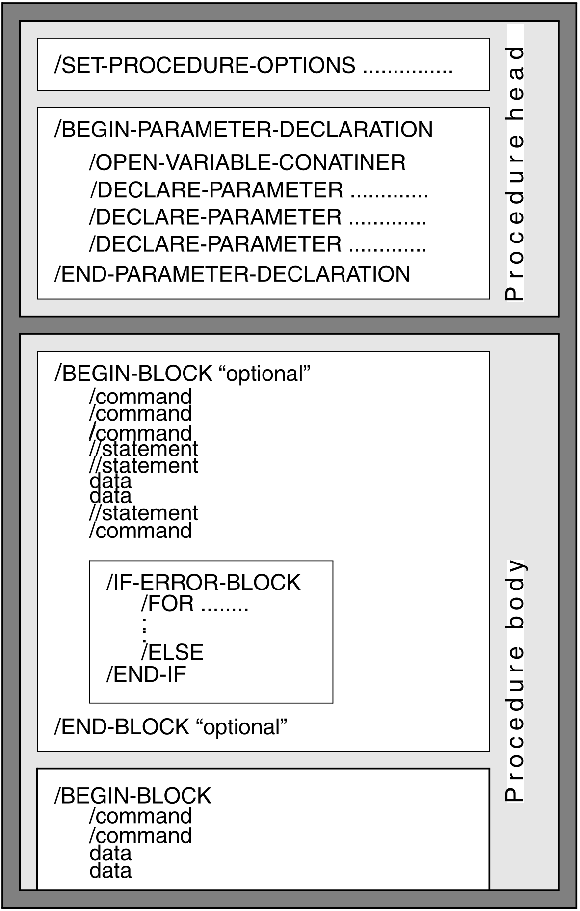 The procedure body contains the commands, statements and program data. Commands which are logically associated together form a command block, which in turn consists of a part containing the commands, statements and data, and an error-handling part. The command block is enclosed between a /BEGIN-BLOCK and an /END-BLOCK. It is possible to define particular attributes for this block, e.g. different handling of the commands and data. If an error occurs, the assigned /IF-ERROR-BLOCK will automatically be processed. The procedure should be terminated by the /EXIT-PROC command.