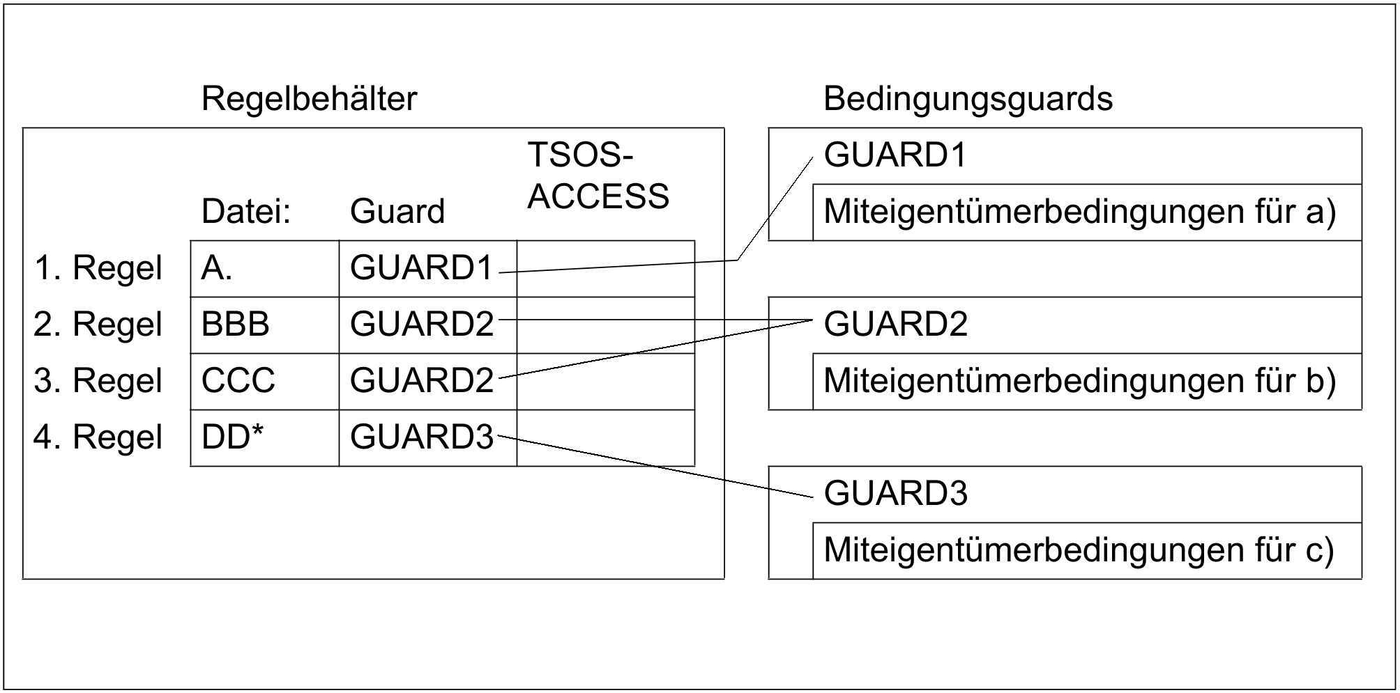 Unter diesen Voraussetzungen benötigt der Anwender drei Bedingungsguards (Guardtyp STDAC), in denen er die unter a) bis c) angegebenen Miteigentümerbedingungen definiert. Zusätzlich muss er einen Regelbehälter anlegen. Die Regeln in diesem Regelbehälter bestehen aus folgenden Teilen: