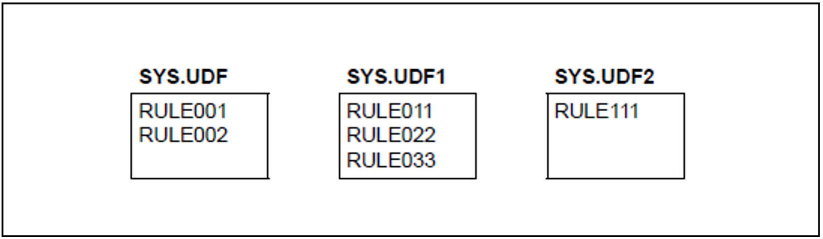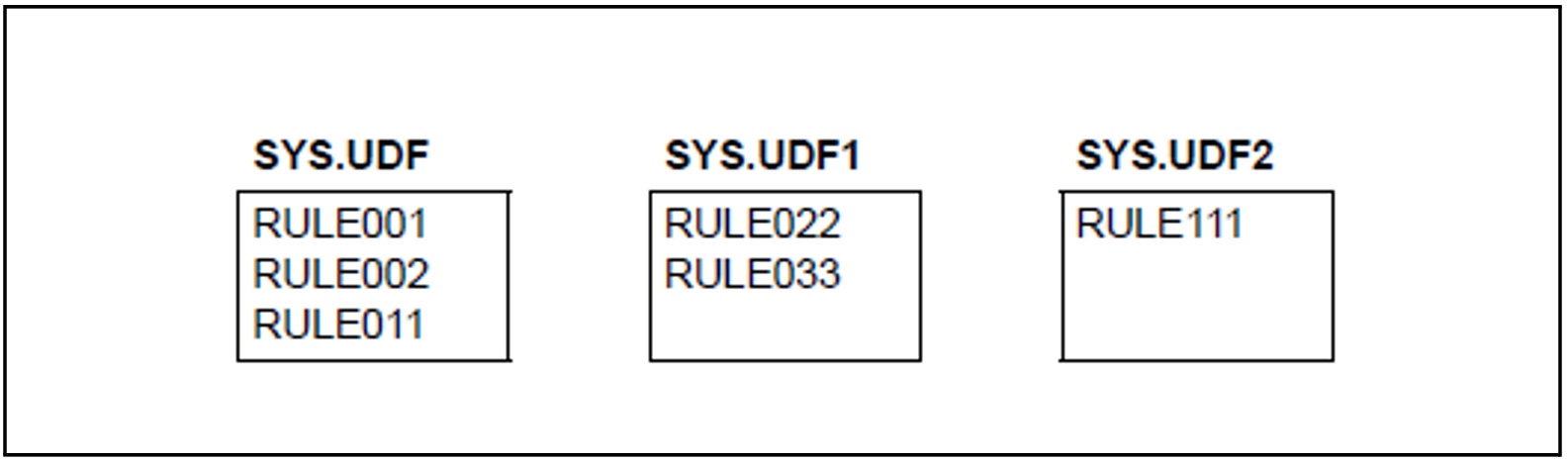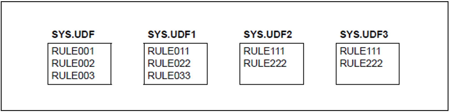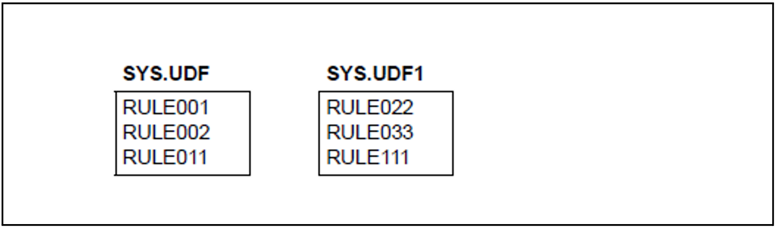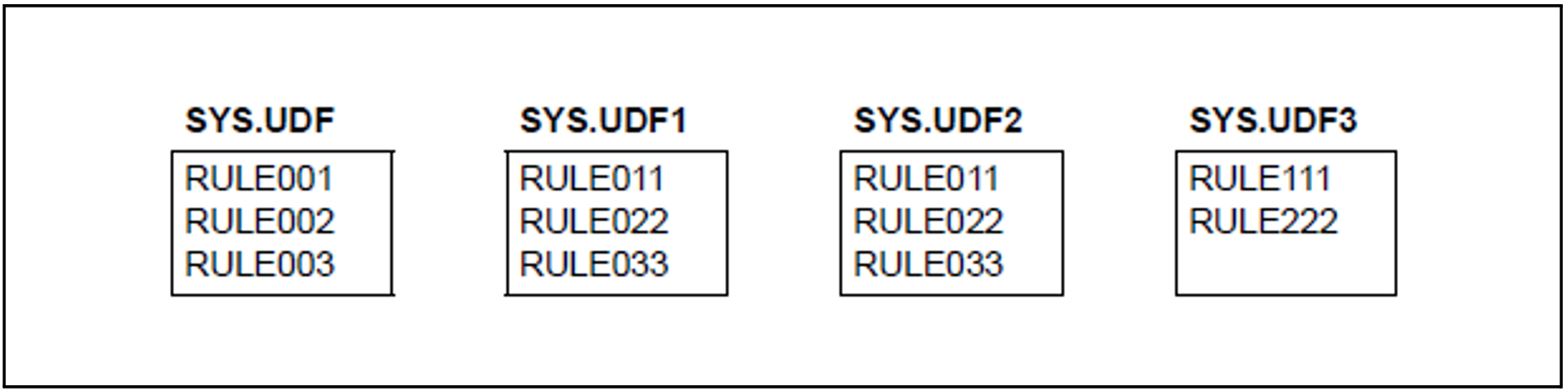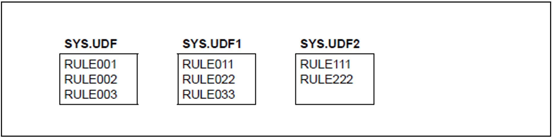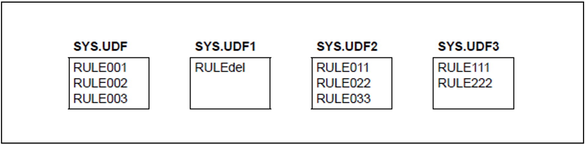 In einer aktiven Regelbehältersequenz SYS.UDF - SYS.UDF3 enthält der Sekundärbehälter SYS.UDF1 nur noch eine einzige Regel, die entfernt werden soll. Da beim Löschen einer letzten Regel der ganze Regelbehälter gelöscht wird, muss verhindert werden, dass die Namenskette abreißt, damit auch die Regelbehälter SYS.UDF2 und SYS.UDF3 weiterhin als aktive Fortsetzungsbehälter berücksichtigt werden.