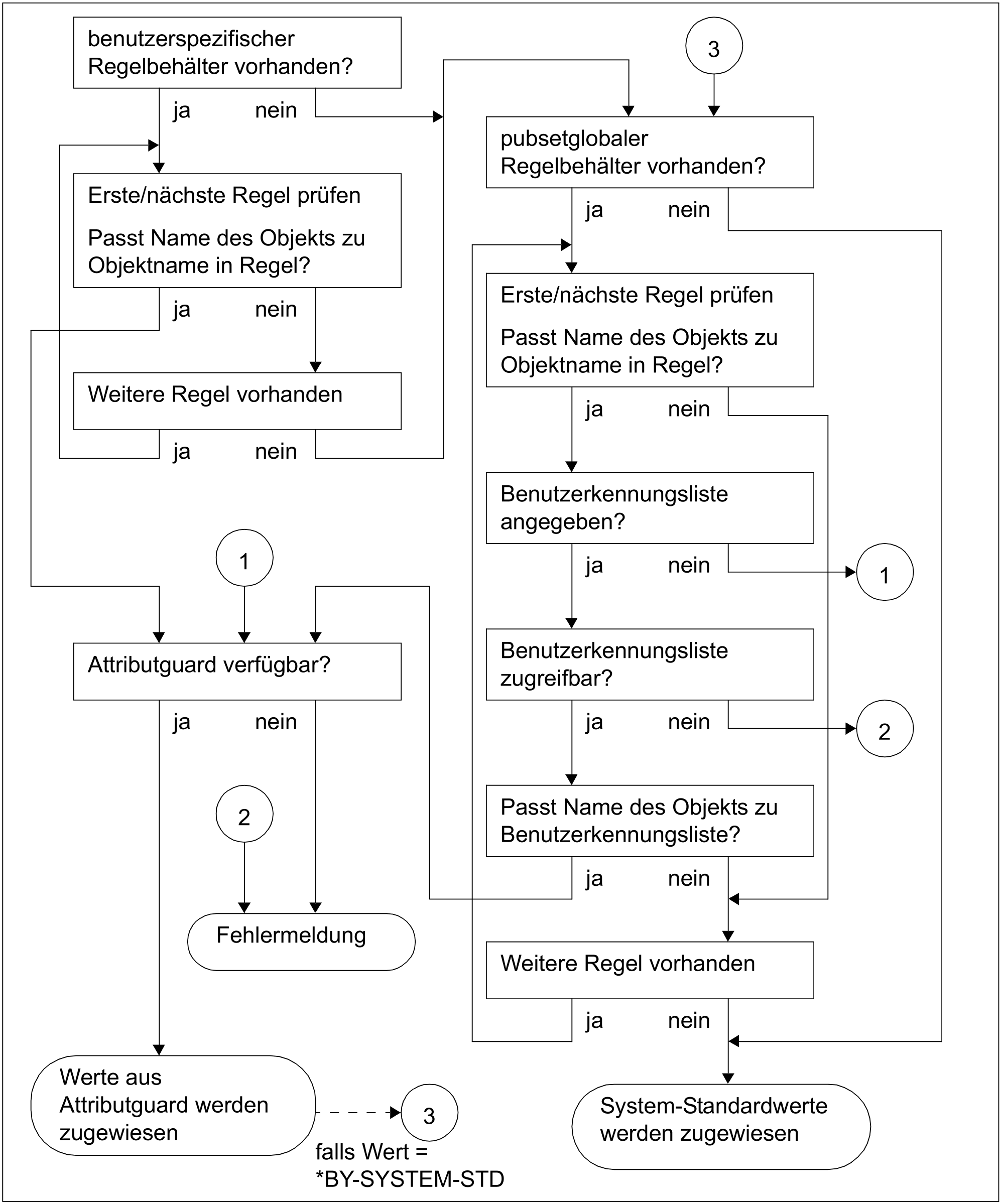 Ist eine passende Regel gefunden, wird die Suche im Regelbehälter abgebrochen. Die entsprechenden Standardwerte werden zugewiesen. Ist für ein Attribut als Standardwert *BY-SYSTEM-STANDARD angegeben, hängt die weitere Suche vom Typ des Regelbehälters ab, in dem die Regel gefunden wurde: