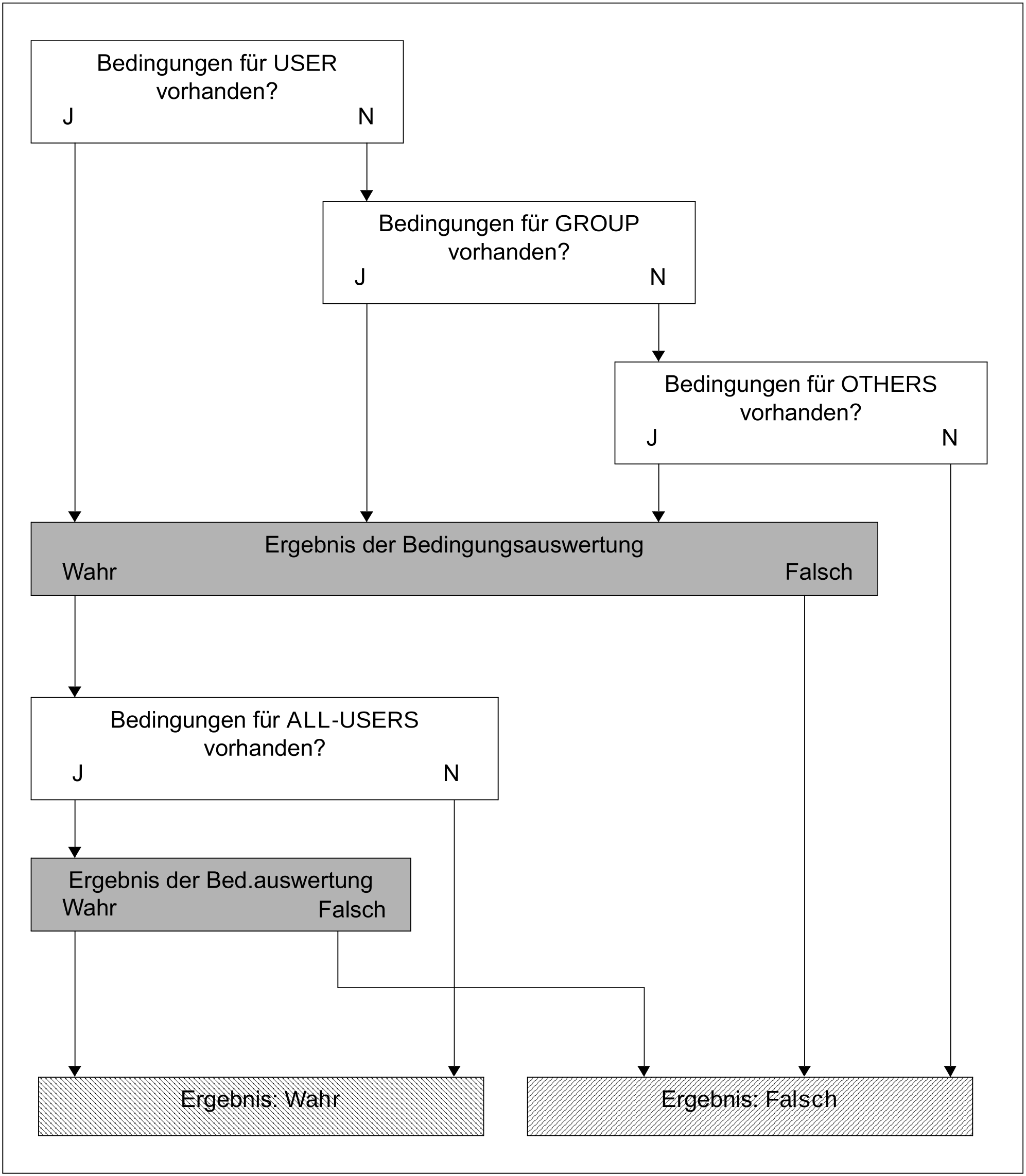 Greift z.B. Subjekt MARY zu, wird nach Überwindung der ersten Schutzhürde (WAHR) die zusätzlichen ALL-USERS-Prüfung durchlaufen, die das Prüfergebnis FALSCH liefert. Greift ein Subjekt zu, das nicht unter die Kategorien USER und GROUP fällt, wird die OTHERS-Prüfung durchlaufen, die das Ergebnis FALSE liefert. In diesem Fall wird die Prüfung abgebrochen, ohne dass die ALL-USERS-Prüfung durchlaufen wird.