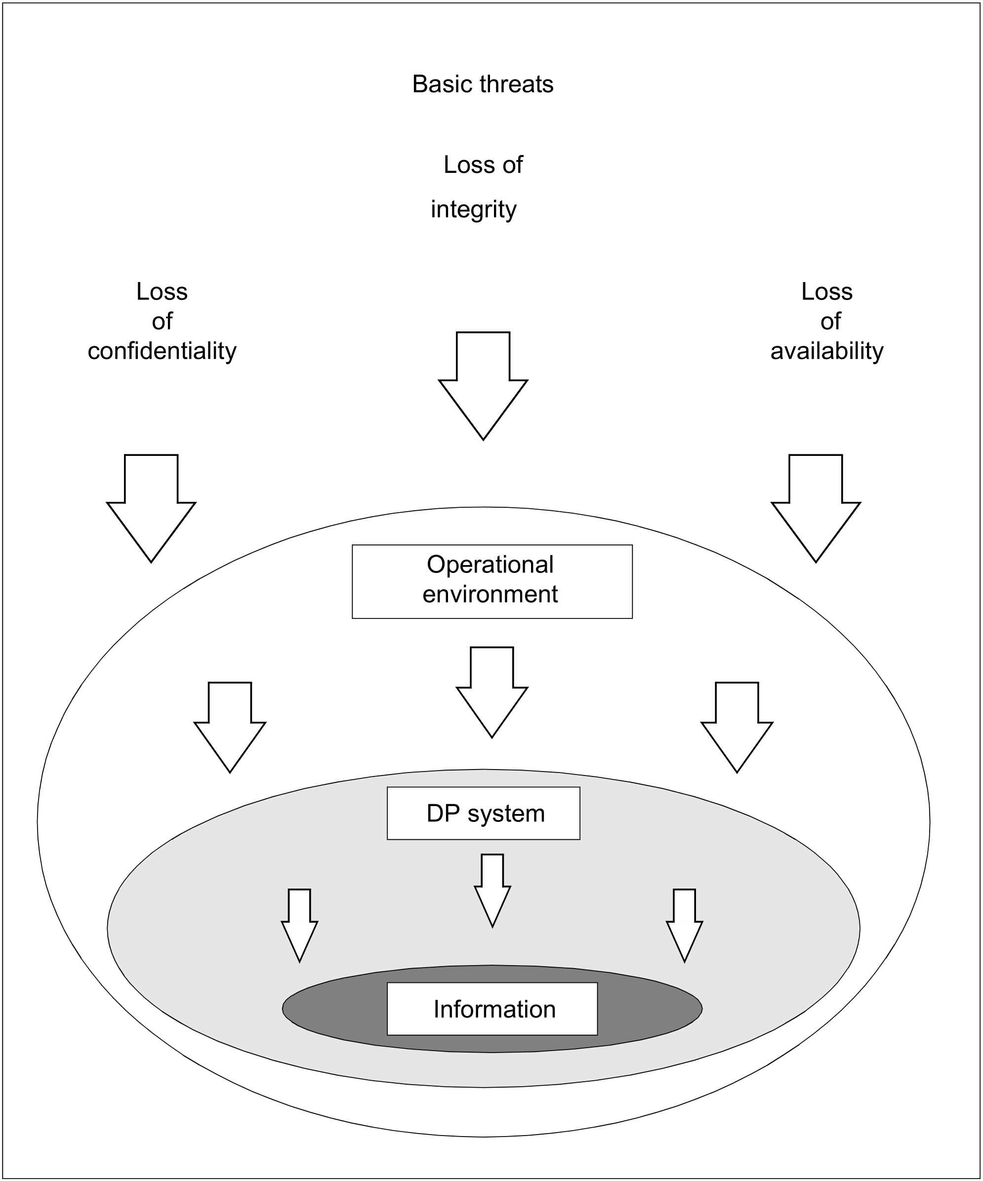 Three basic threats to the security of a DP system can be distinguished; these threats are contingent on the function which the system serves, its operational environment and the sensitivity of the data stored in the system (see figure 1):