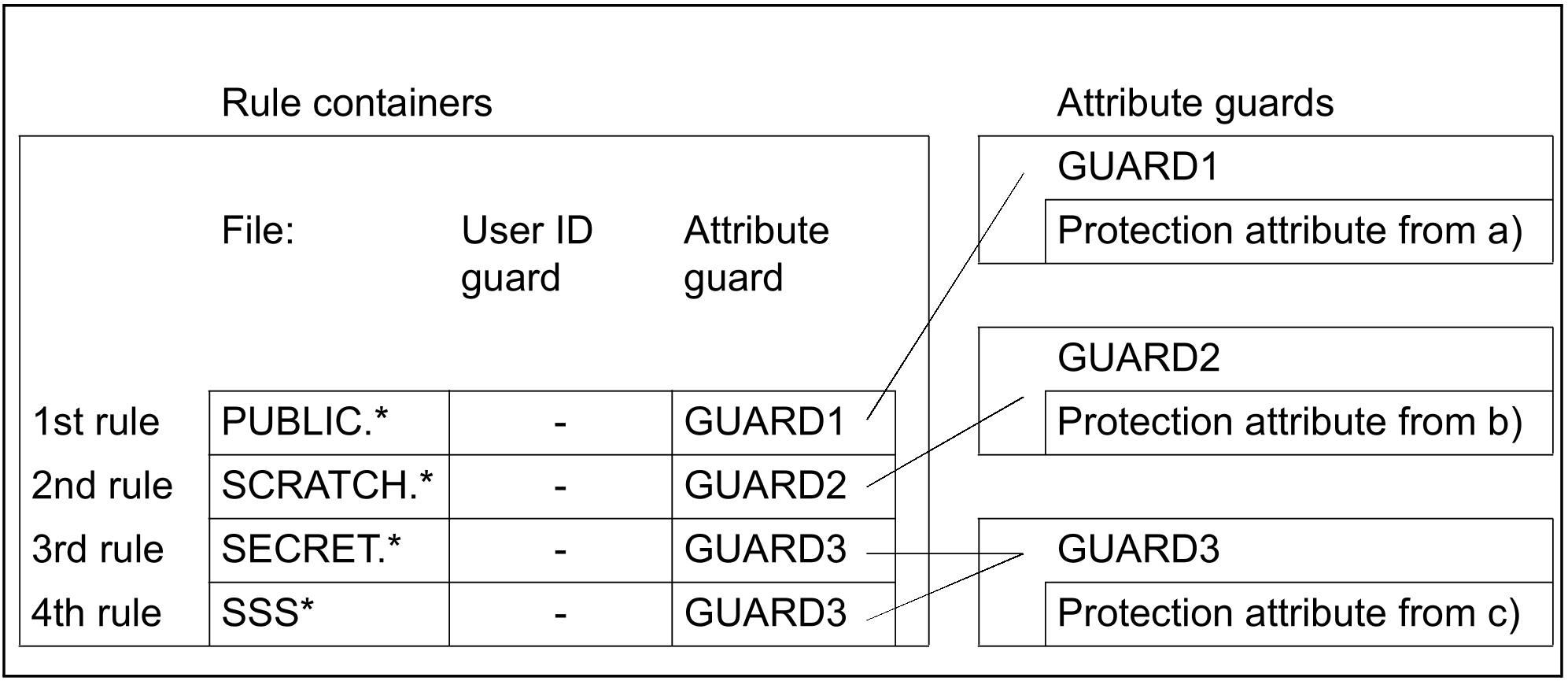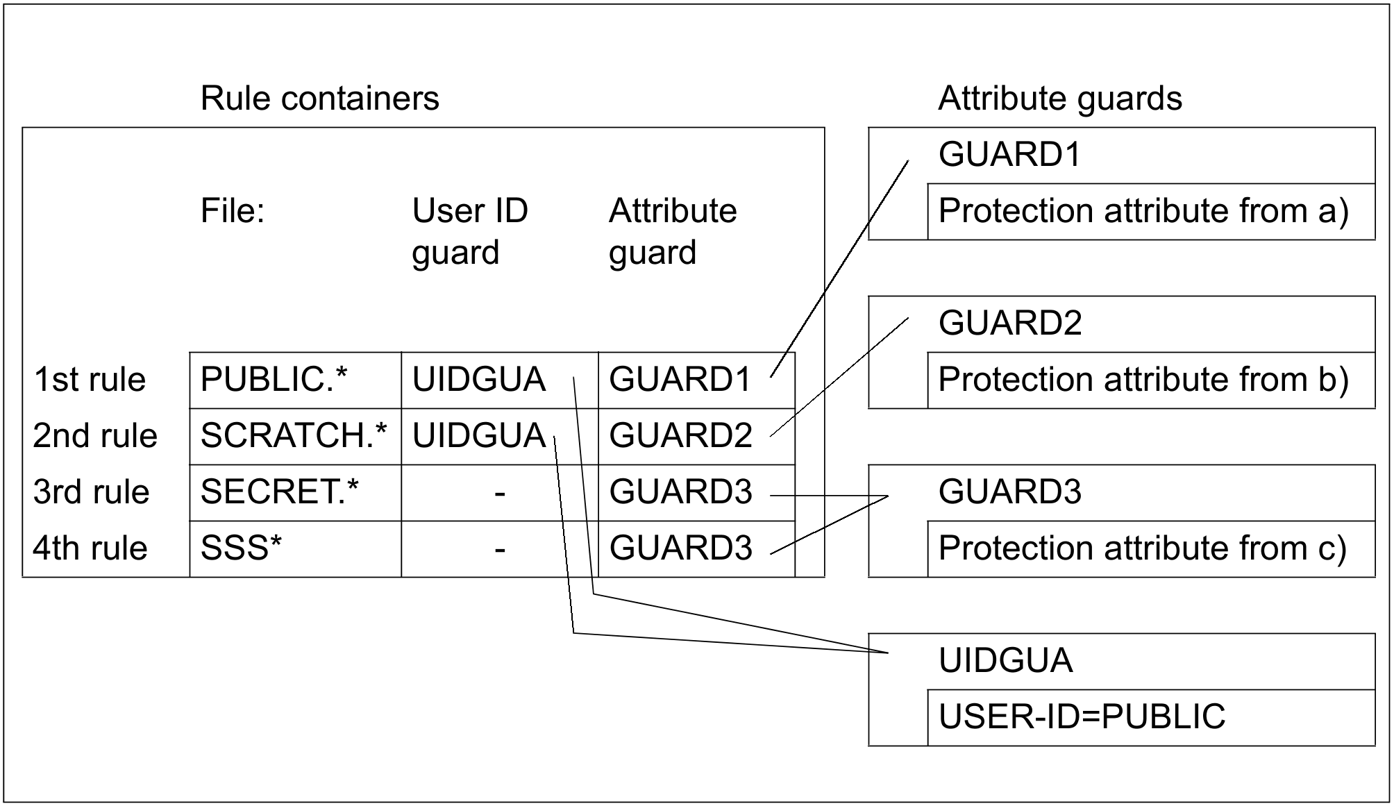 System administration wants to make the same pubset-global specifications as the user in example 1. However, the protection attributes in a) and b) are only to apply to files created under the user ID PUBLIC. The necessary rule containers and guards are depicted in the diagram below: