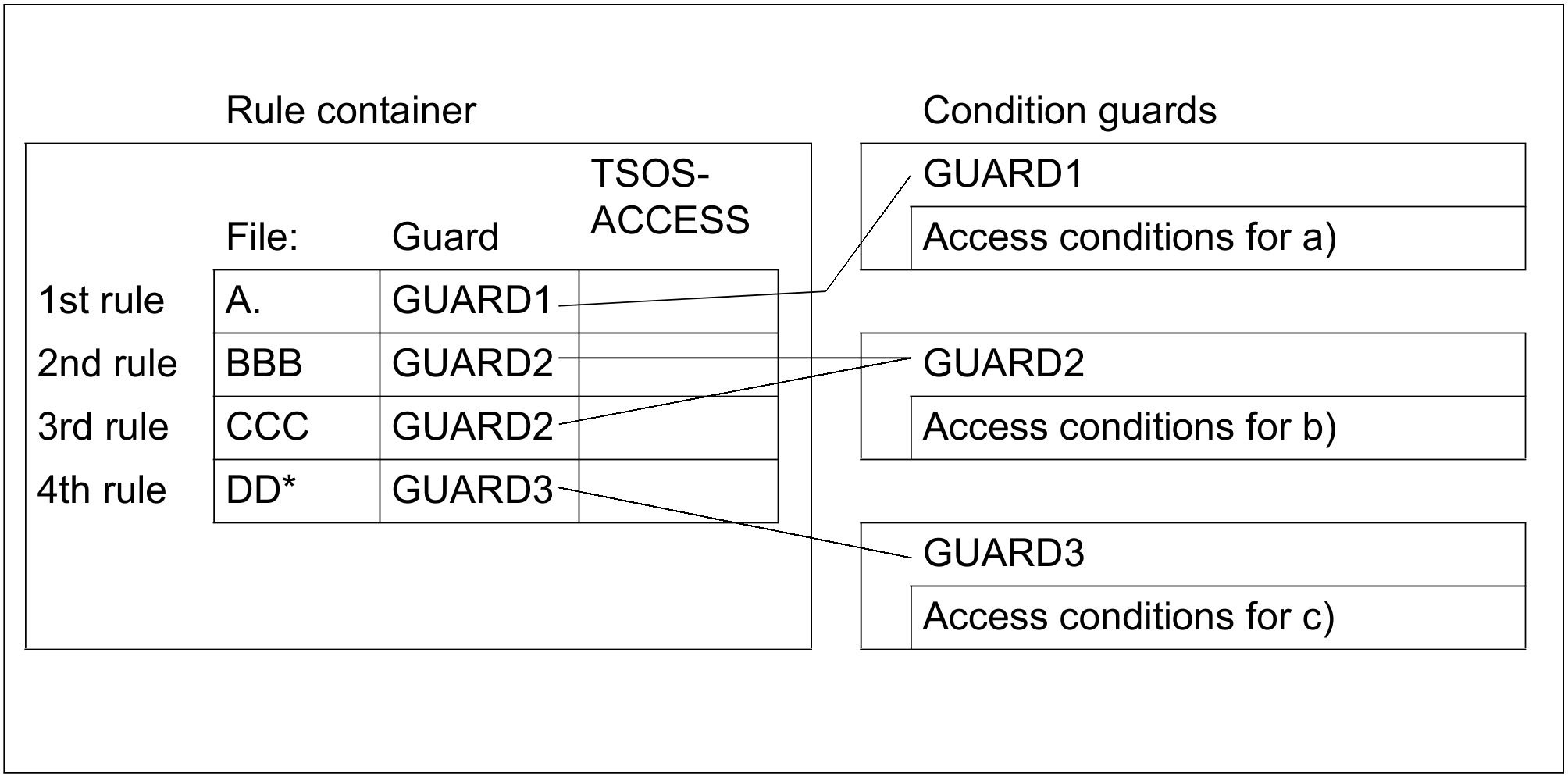 Given these requirements, the user needs three condition guards (guard type: STDAC) in which to define the access conditions specified in a) to c). It is also necessary to create a rule container. The rules in this rule container consist of the following parts: