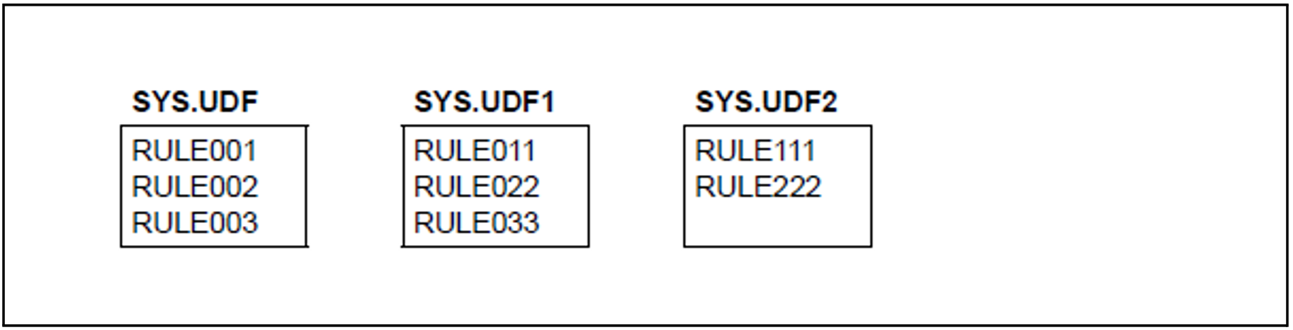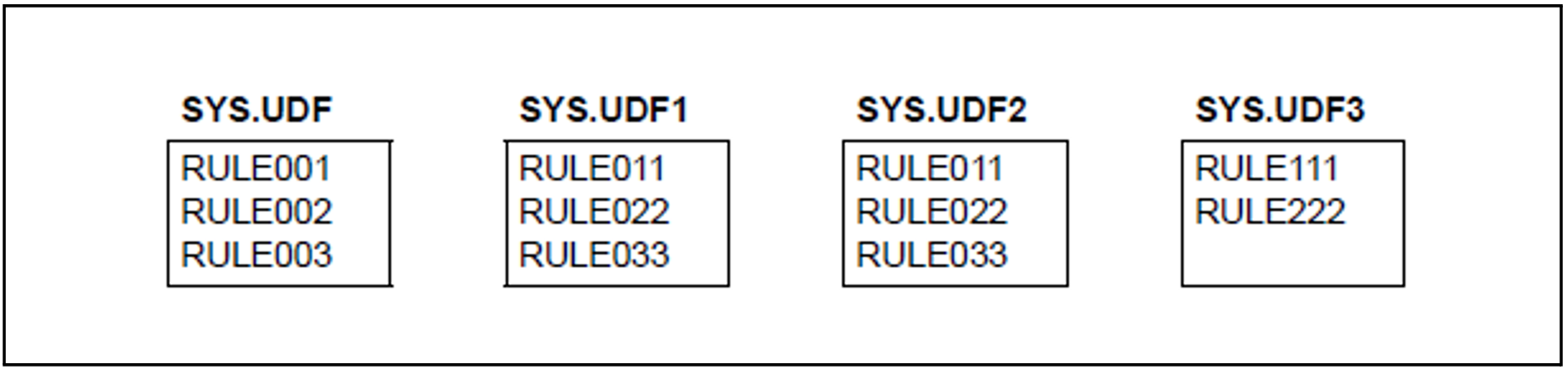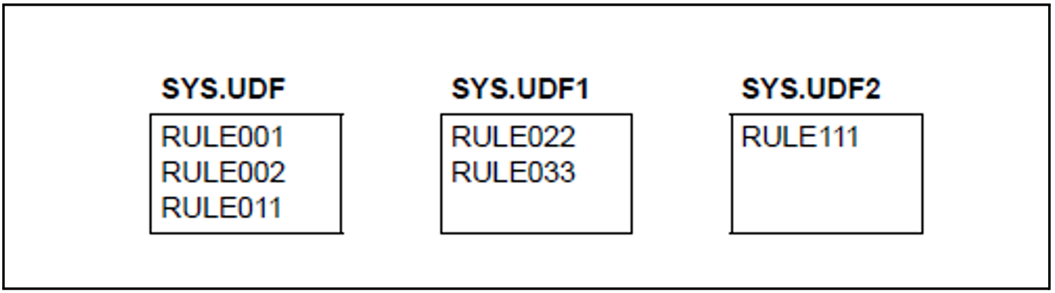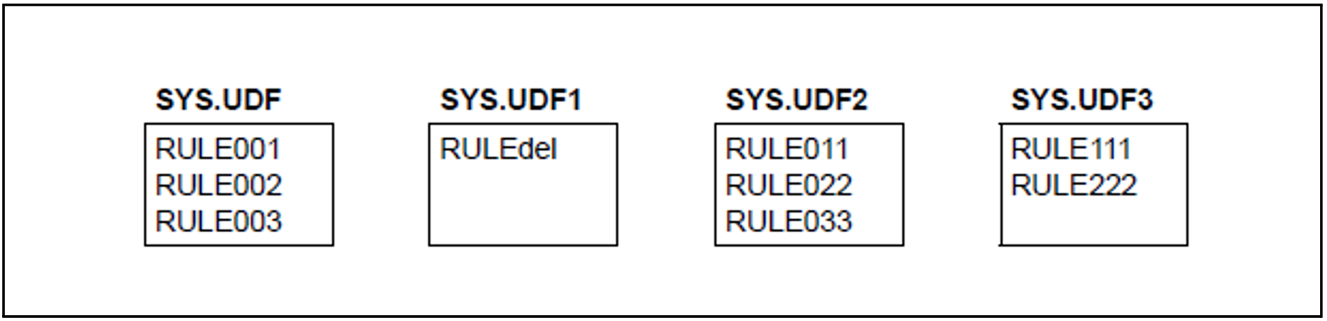 Initially, the first rule of the first secondary container SYS.UDF1 is inserted after the last rule of the primary container SYS.UDF. It is then deleted from SYS.UDF1.