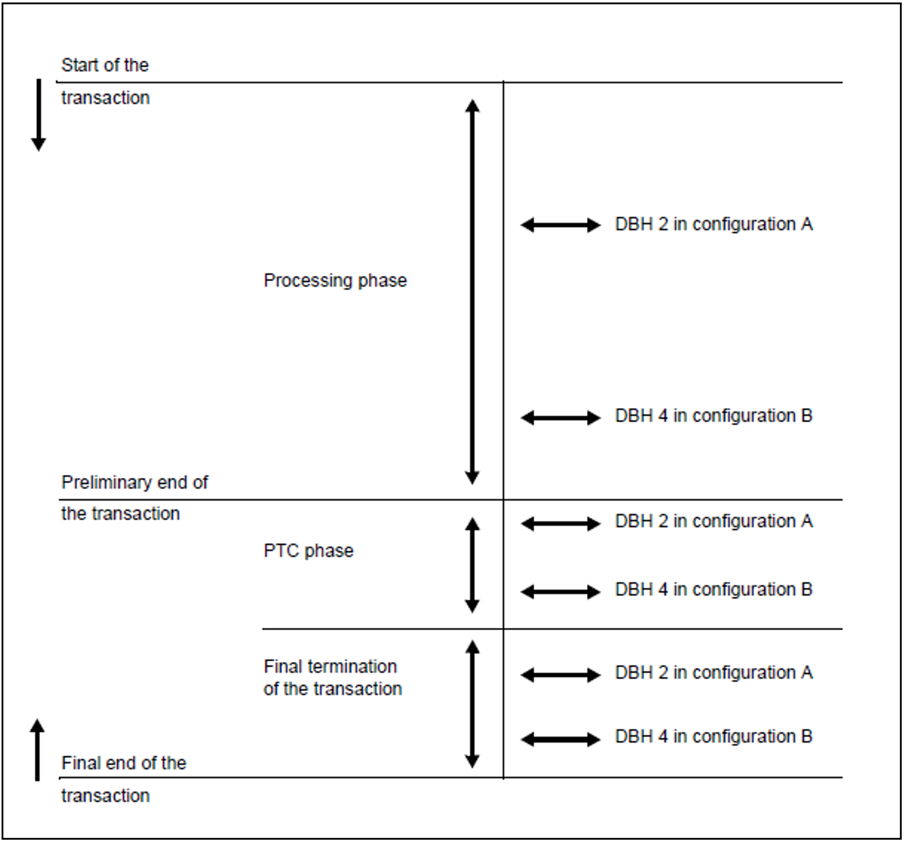 The way in which the DBH handles the transactions varies, depending on the time at which the system failed: