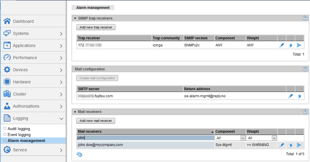- The selected user receives mails for every event of the Sys-Mgmt component (system management of the SUs) with the weight >=WARNING.