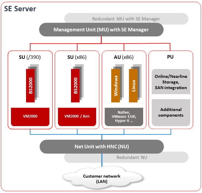 Multiple AUs can be operated on the SE server. An AU enables operation of applications under Linux, Windows or hypervisor-based systems.