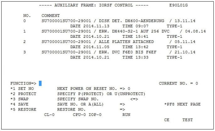 5 | RESTORE | restores an IORSF: enter the numbers in the field RESTORE NO. ==> 'blank' |