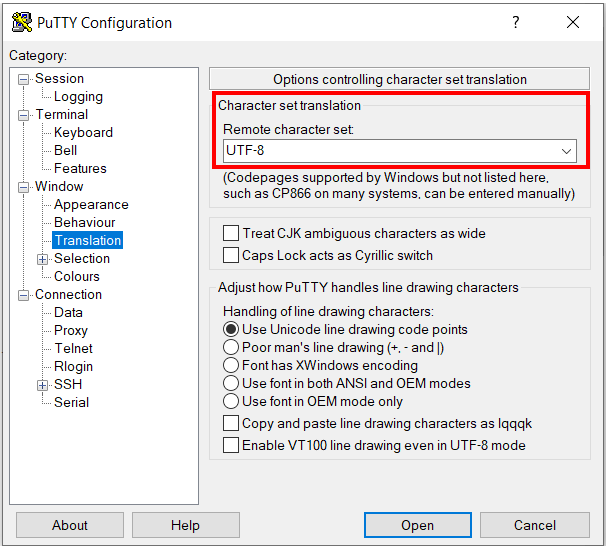 Make sure to use the default character set UTF-8 that supports the display and the keyboard shortcuts required in the BS2000 dialog (Window -> Translation menu):