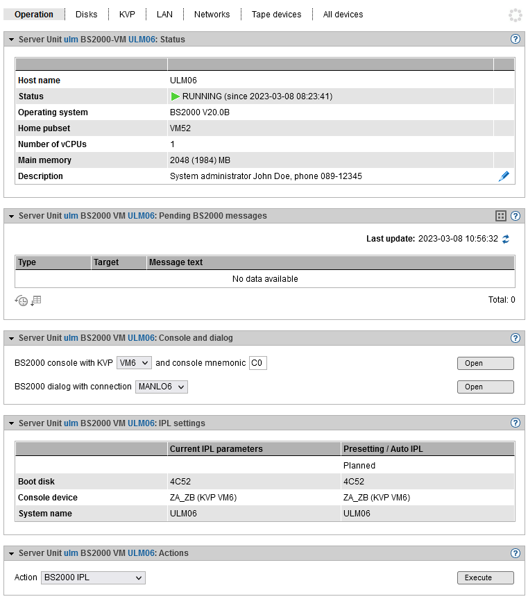 The Operation tab displays the status of the VM, enables you to enter or change a description of the VM, displays pending BS2000 messages, offers access to the BS2000 console and BS2000 dialog, and allows the following actions, depending on the situation: