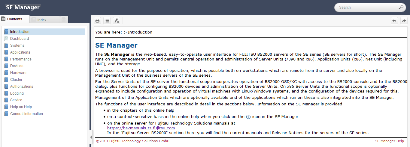 The area on the left contains the table of contents, which is structured in a similar way to the primary and secondary navigation of the SE Manager.