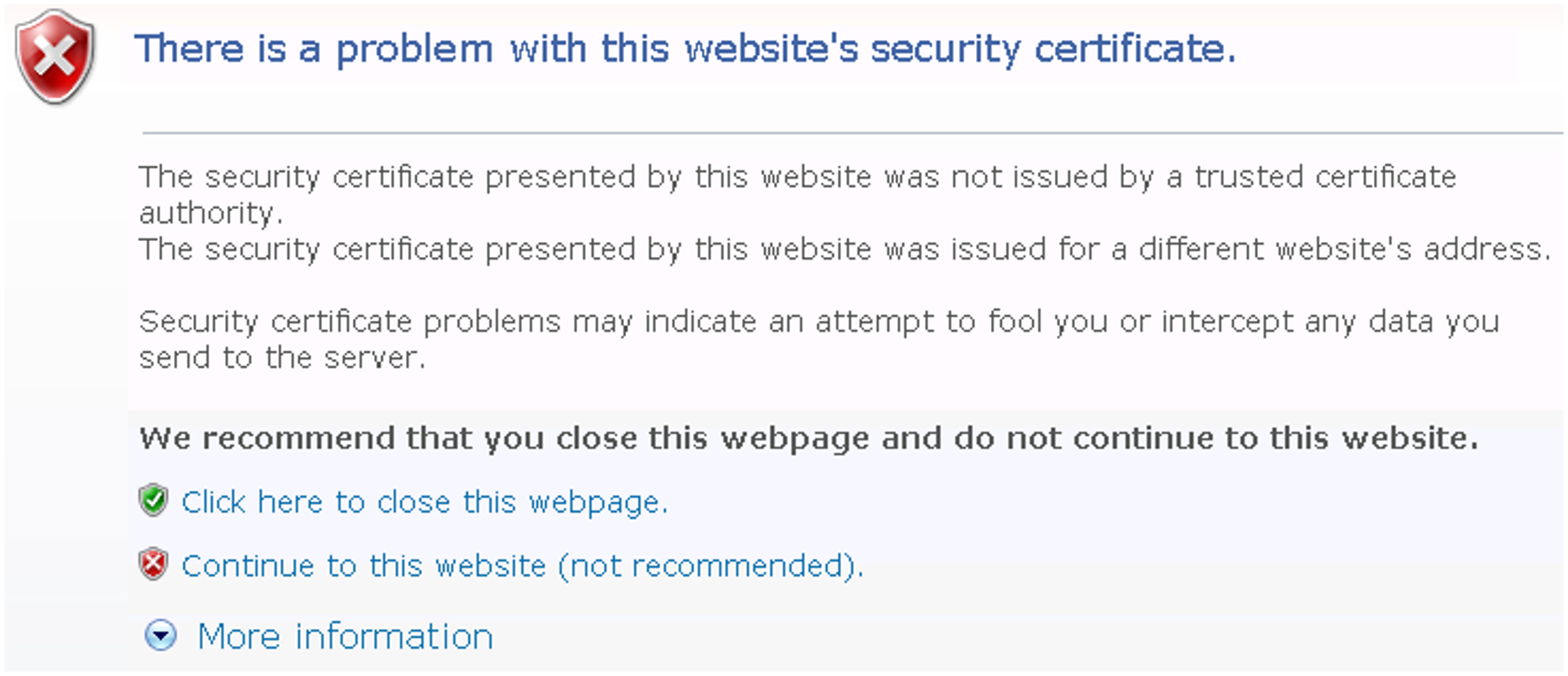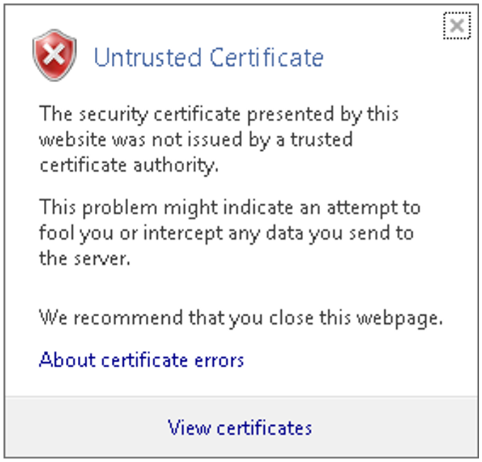 > | Click Certificate error in the browser‘s address bar. You are shown information about the potential security risk, and About certificate errors enables you to view more detailed information in the browser’s online help. |