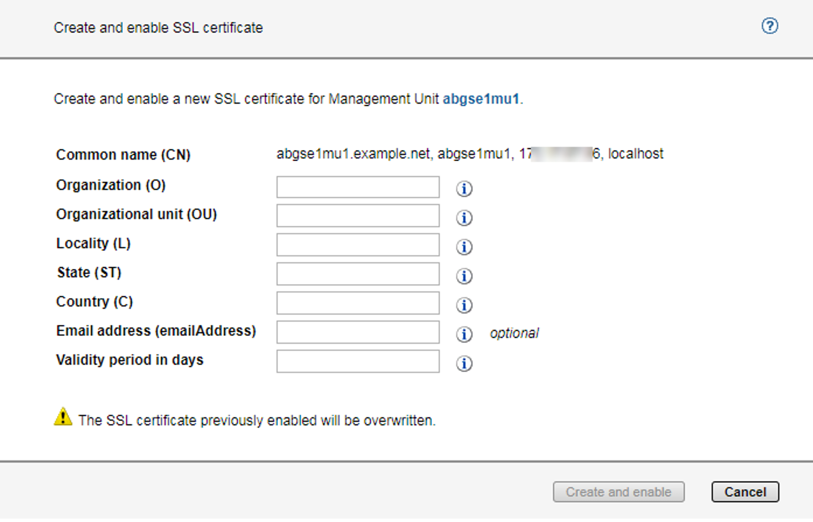 > | Click Create and enable new SSL certificate above the table. A dialog opens: Enter the most important data for the certificate. The value for the Common name (CN) is predefined and contains the system’s fully qualified domain name (FQDN). Information on the attributes Organization (O), Organizational unit (OU), Locality (L), State (ST), Country (C), Email address (emailAddress), Validity period in days is provided in the online help. |