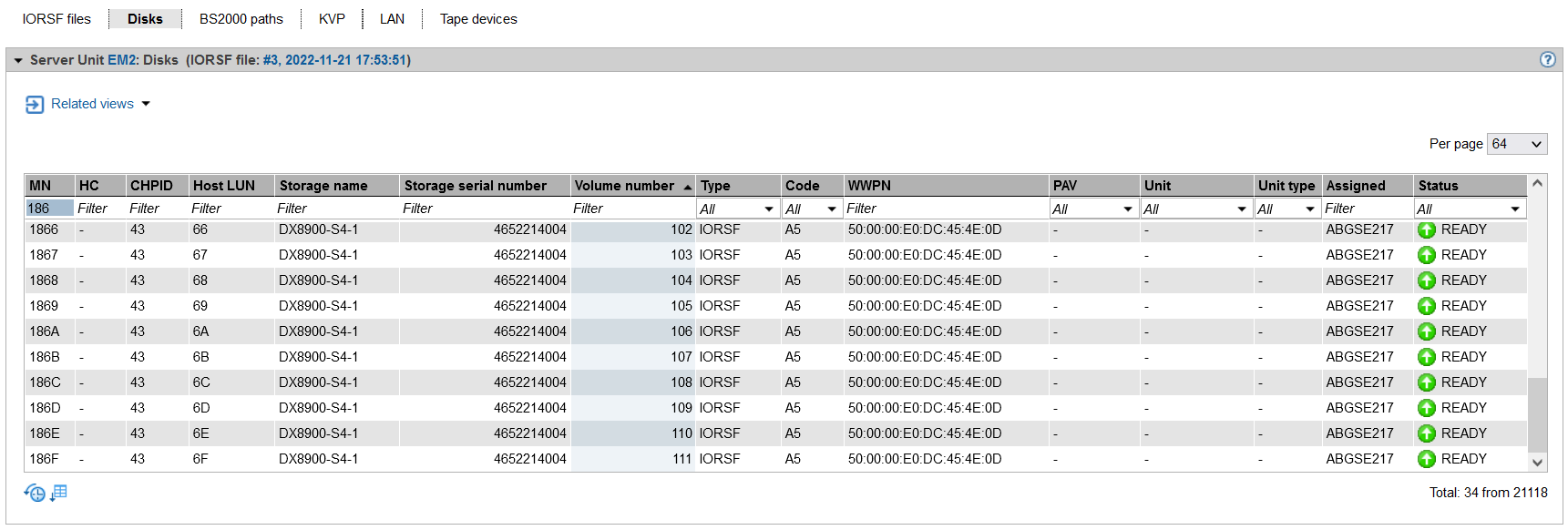 The Disks tab provides information about the BS2000 disks which are configured in the active IORSF file.