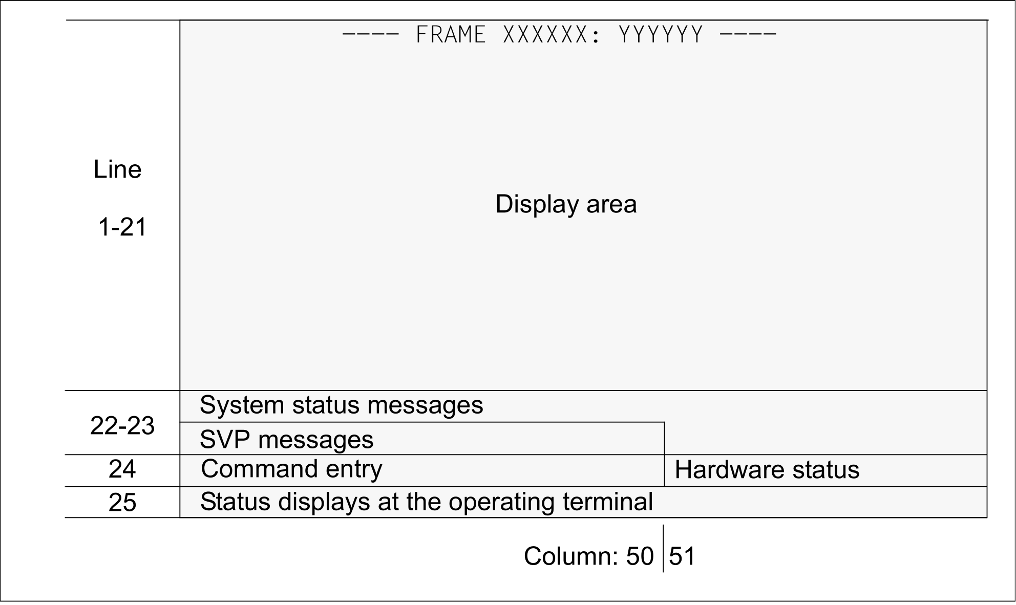 Lines 1 - 21 | This is the display area of a frame. Here the functions and parameters that may be selected or output are displayed. Hardware-related information is also output. |