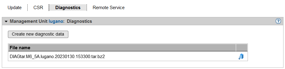 An already existing diagnostic data file is displayed. You can generate new diagnostic data, in which case an existing diagnostic data file is overwritten. The file name shows the basic software for which and when the diagnostic data was generated. For an MU the name has the following format: