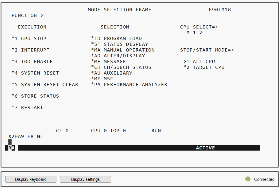 > | Press the Enter key. The MODE SELECTION FRAME appears. If the SVP has already been worked with, the last frame used will appear. You reach the MODE SELECTION FRAME by entering You can operate the SVP console in the familiar manner using the keyboard. A virtual keyboard is also available to you for making entries on the SVP console. Click Display keyboard at the bottom left to open the virtual keyboard. By clicking Hide keyboard you then may close the keyboard display again. Enter the alphanumeric characters shown in the frame in the input fields marked by an arrow ( |