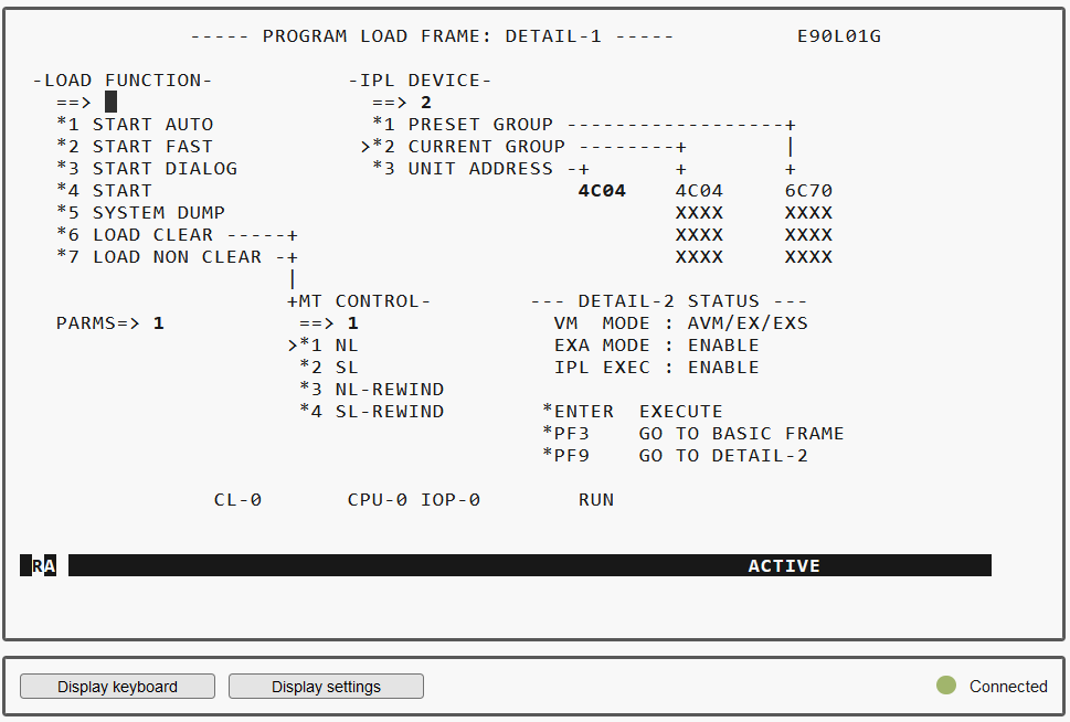 > | In VM2000 mode, switch to the PROGRAM LOAD FRAME: DETAIL-2 if necessary using PF9 in order to check the settings for loading the VM2000 firmware. In VM2000 mode, |