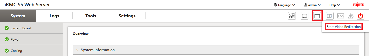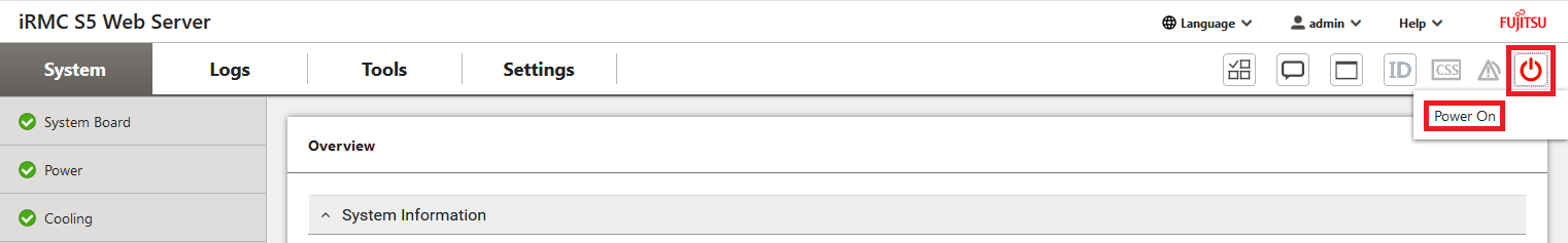 > | In the iRMC window, click on the System power button icon in the upper right corner and then on Power on.