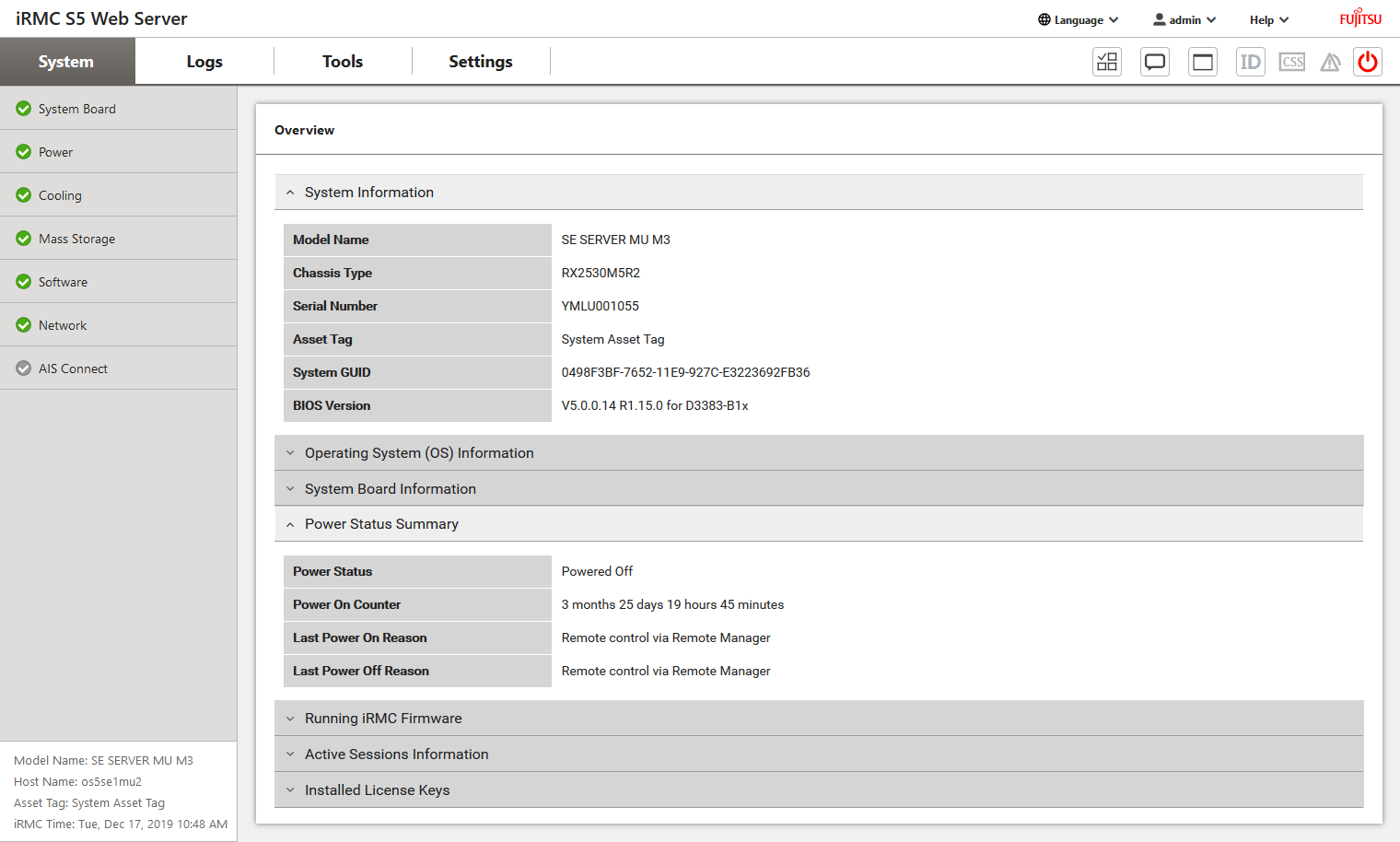 | > | Enter the iRMC account admin (or another administrator account) as Username and the current password and click Login. Change the initial password for the iRMC account admin immediately after the first login (see also information in chapter "Introduction"). After a successful login the browser window displays the System Overview of the iRMC’s graphical user interface. The Power Status Summary group shows that the MU is shut down. |