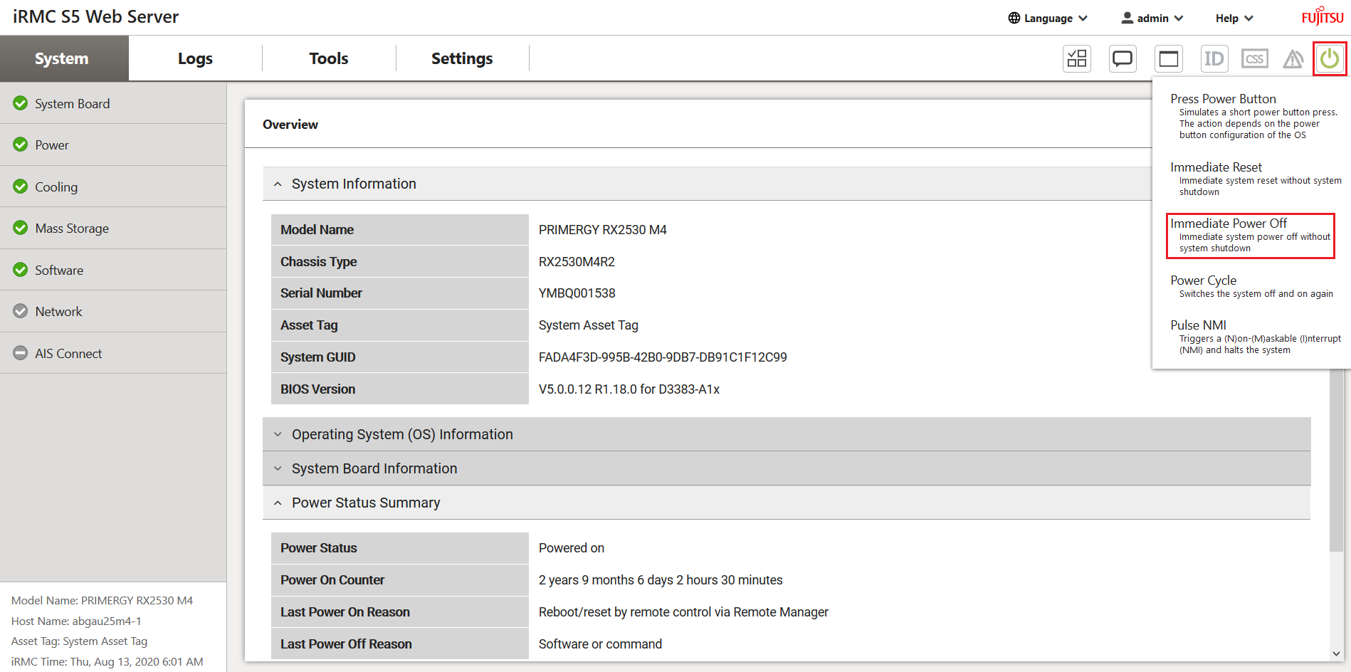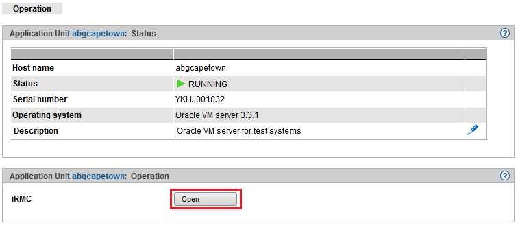 > | Click Open next to iRMC in the Operation tab in the Operation group. In the case of a partitionable AU (an AU PQ, e.g. AU87), systems run on the individual partitions