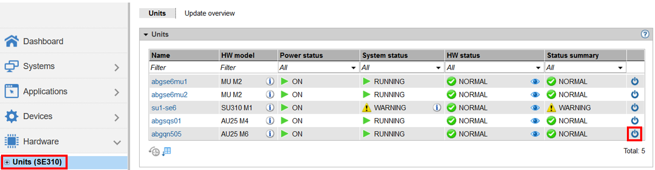 > | In the Units table click the Power on/off icon by the desired AU: |