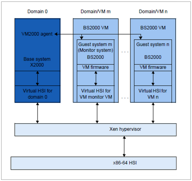 The VM2000 monitor manages the VMs with the guest system BS2000 (BS2000 VM) and provides its functions via the VM2000 user interface.