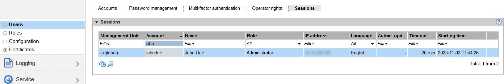 Displaying a global session (see the first column) for the (own, highlighted in blue) account johndoe