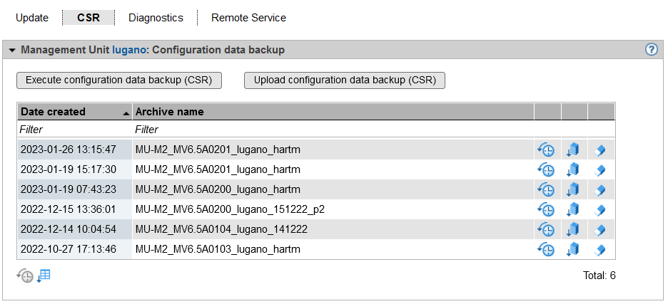 > | Click Execute configuration data backup (CSR) and confirm the action after selecting a file archive for configuration data backup. |