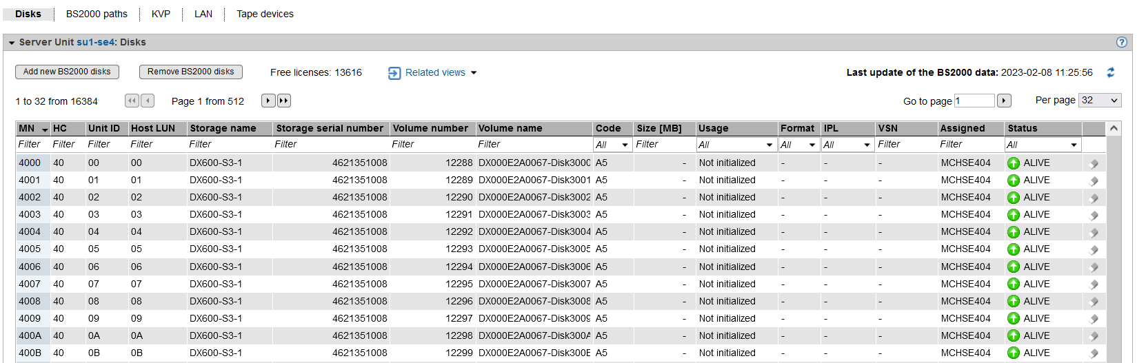 The columns Host LUN, Storage name, Storage serial number, Volume number, Volume name and Status are supplied only, if STORMAN is properly configured and the storage data is updated. For this, the Update storage data dialog in the Hardware -> Storage menu must be called.