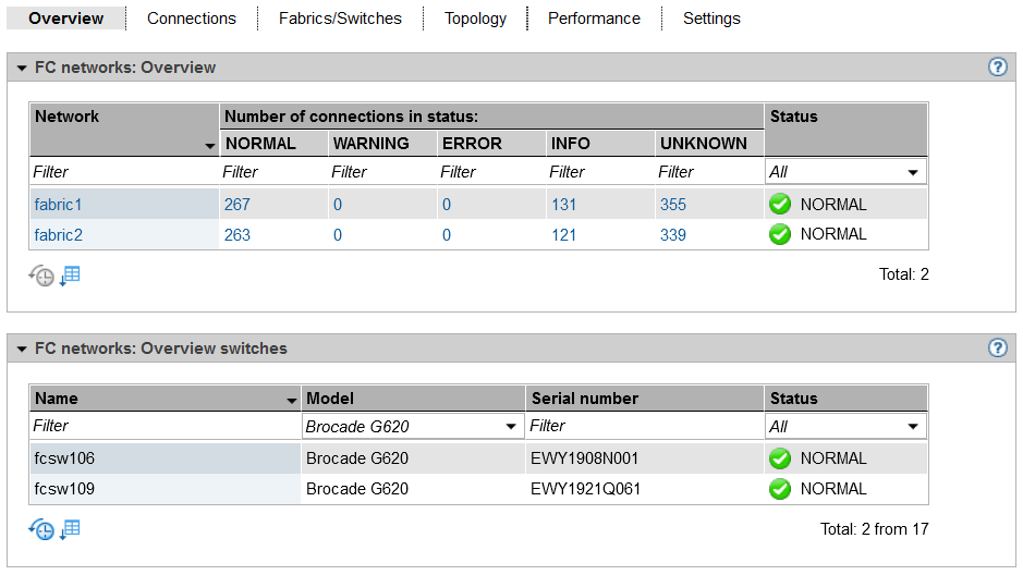The Overview tab provides a summary overview of the connections per FC network (fabric) and of the switches.